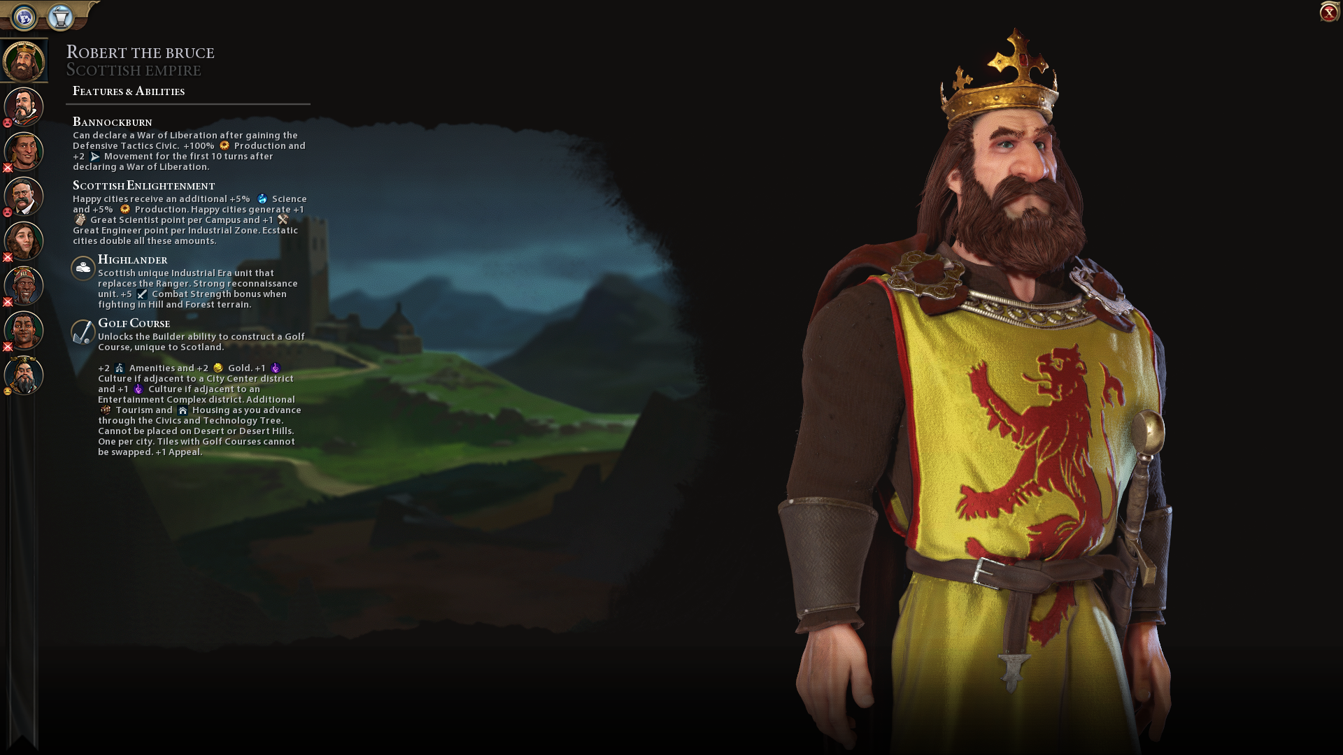 Overall, the Robert the Bruce Civ 6 Scottish leader is a half-decent civilization for securing scientific victories and is ok for cultural players. However, he’s only good for winning space races if you can effectively exploit his Scottish Enlightenment civ ability, which can sometimes be tricky to balance with the primary requirements of building Campus, Industrial Zone, and Spaceport districts. If you can make the most of that civ ability, you can have some super-productive and scientifically enriched cities to propel your Scottish civilization beyond the solar system.
