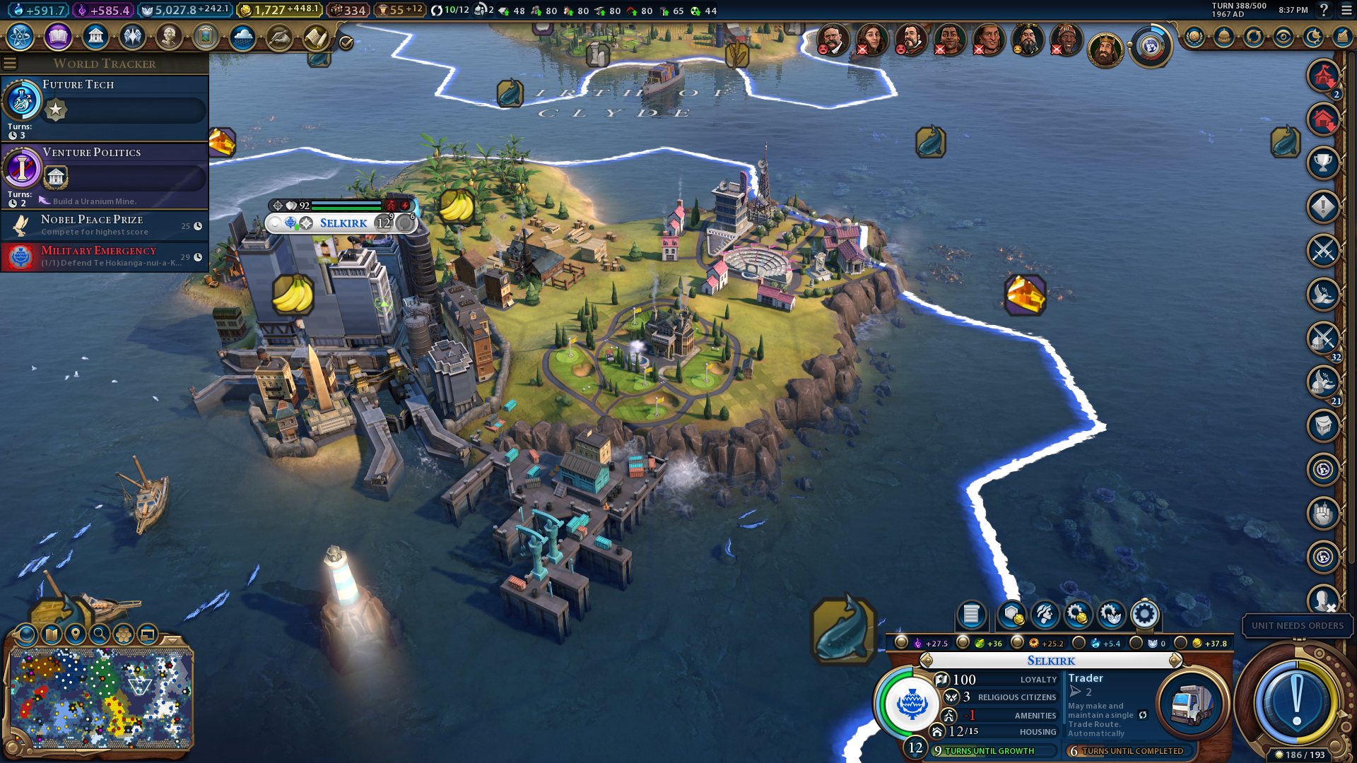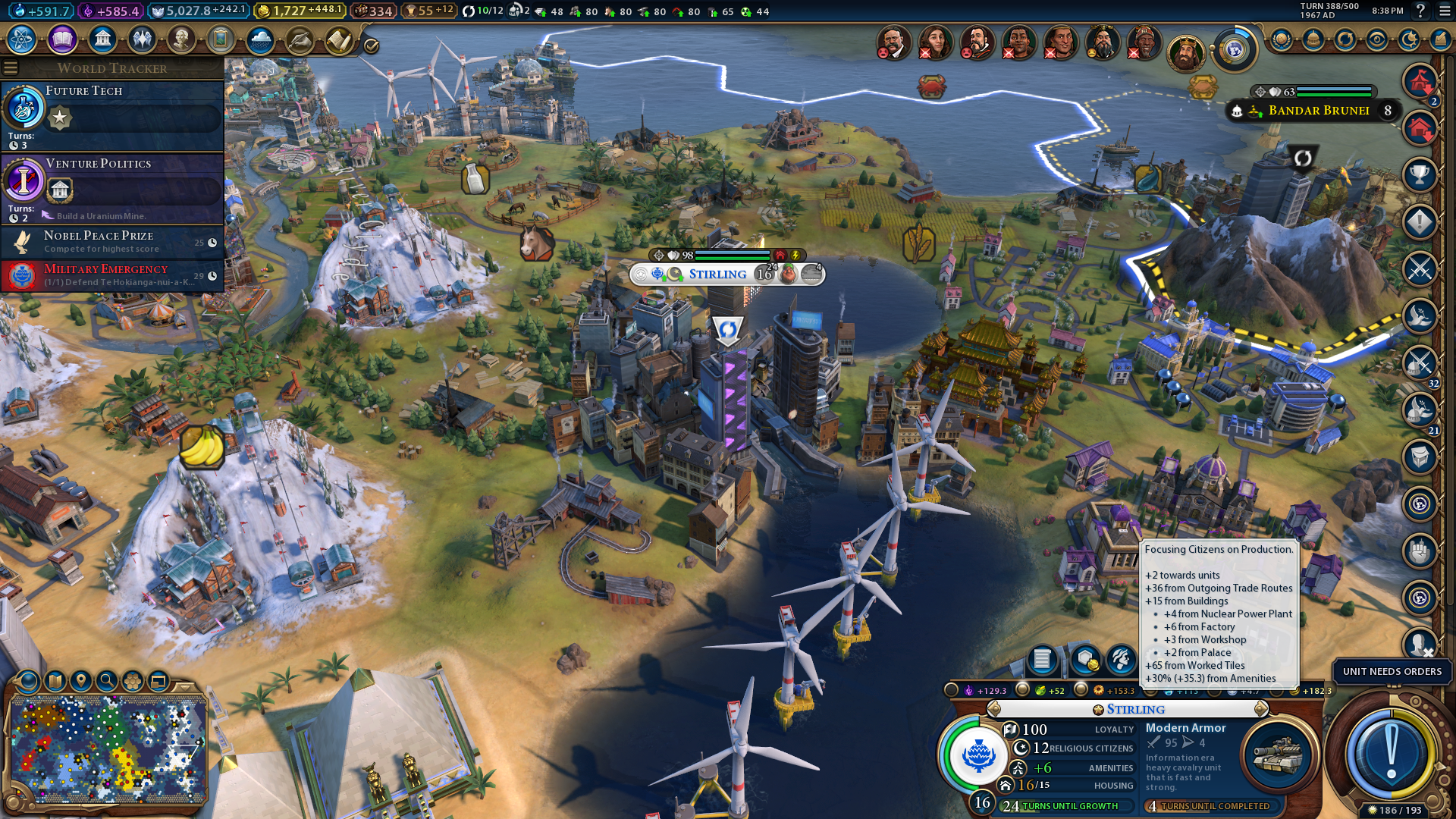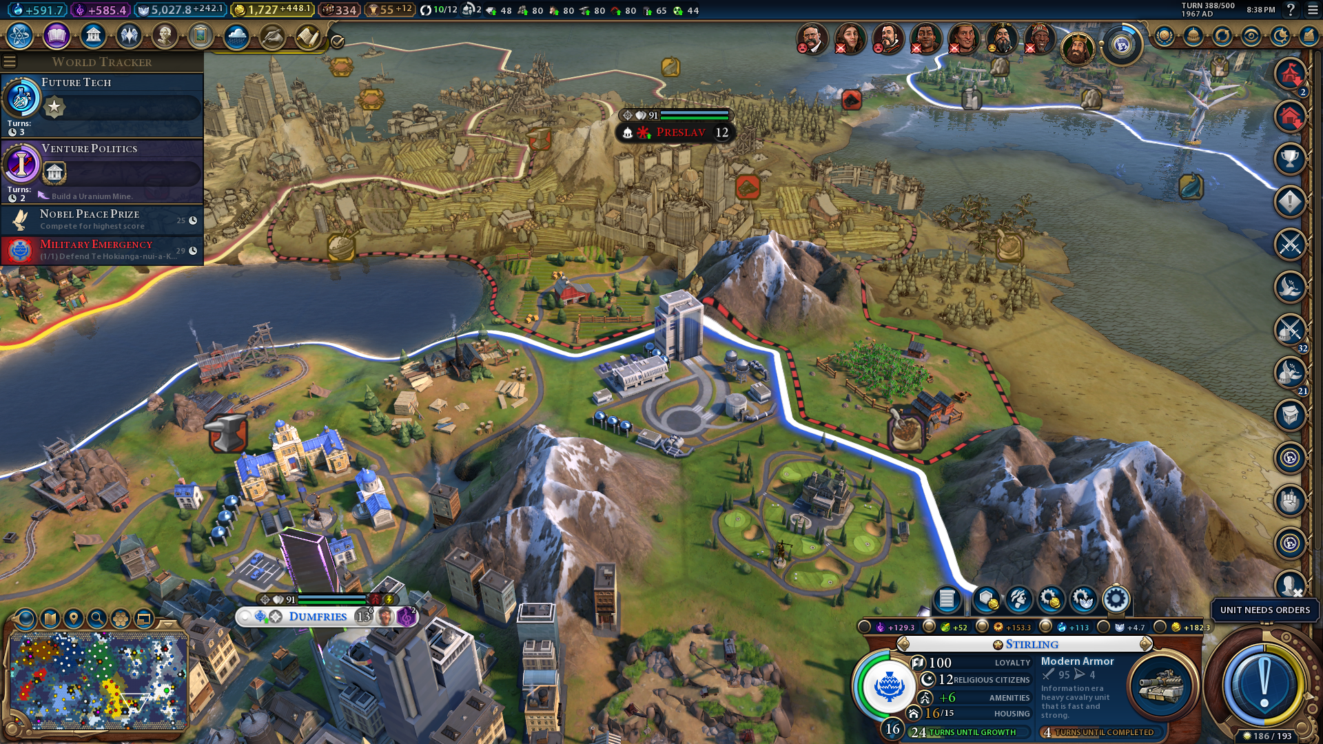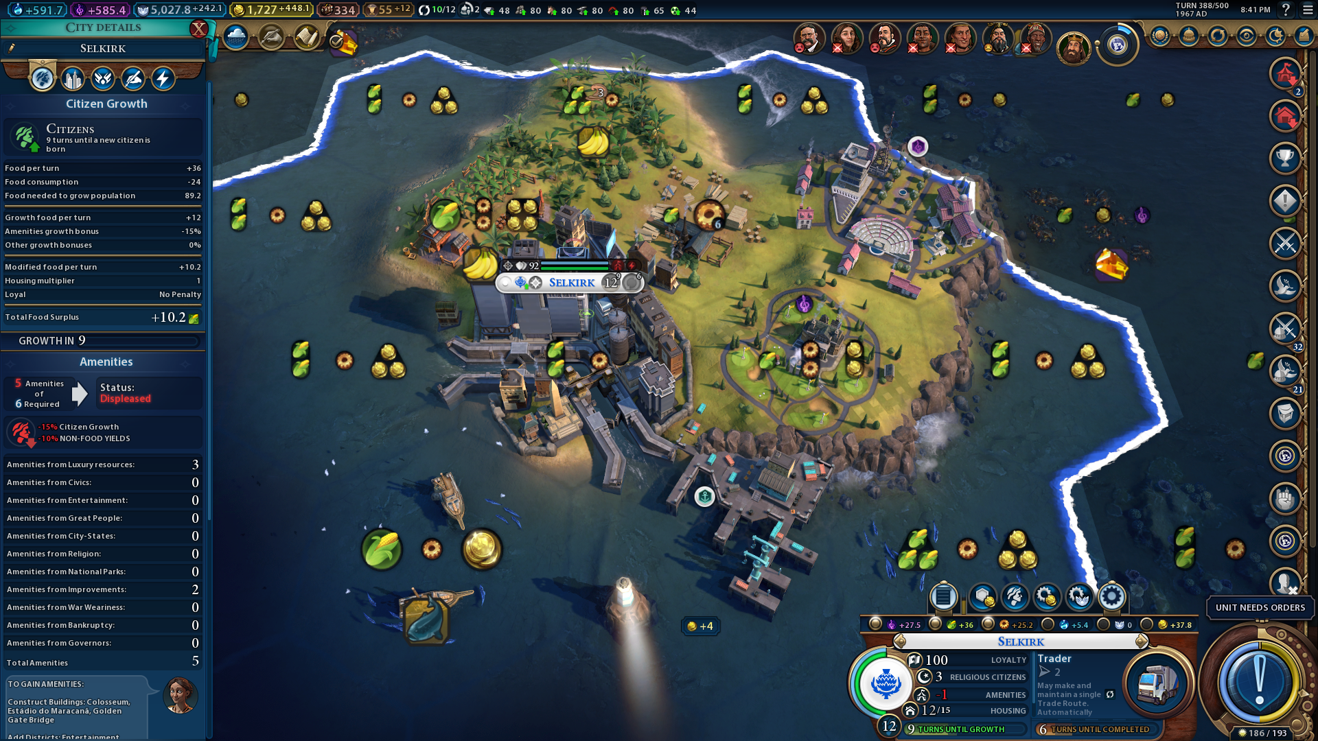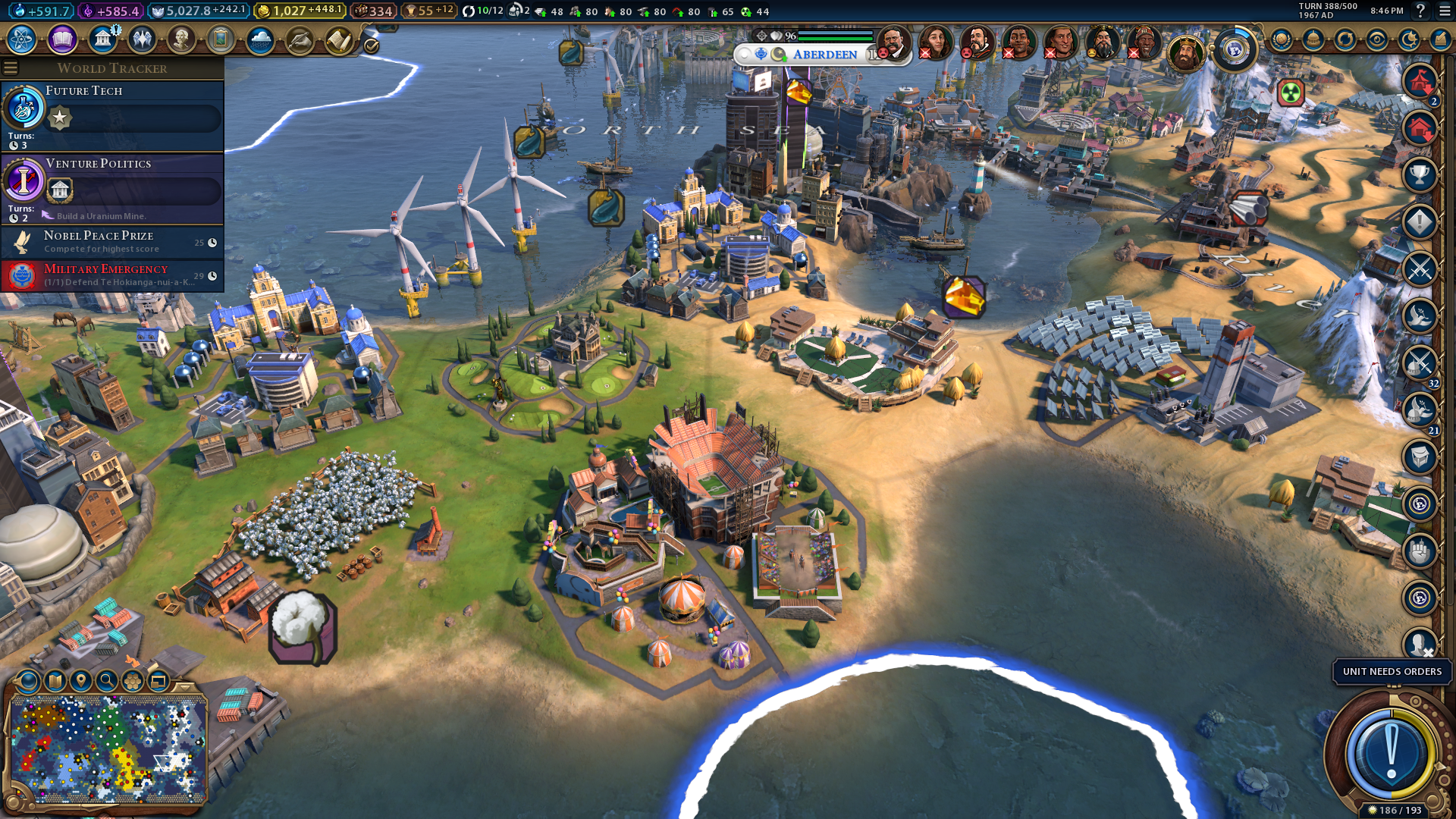 Secondly, because Ski Resorts and National Parks’ tile improvements for boosting tourism also synergize with the Scottish Enlightenment’s ability, as they generate amenities. So, make sure you add plenty of Ski Resorts and National Parks to your Scottish civilization for more amenities and tourism. Note that Golf Courses also raise the appeal of adjacent tiles, which can come in handy for Seaside Resort and National Park placement.