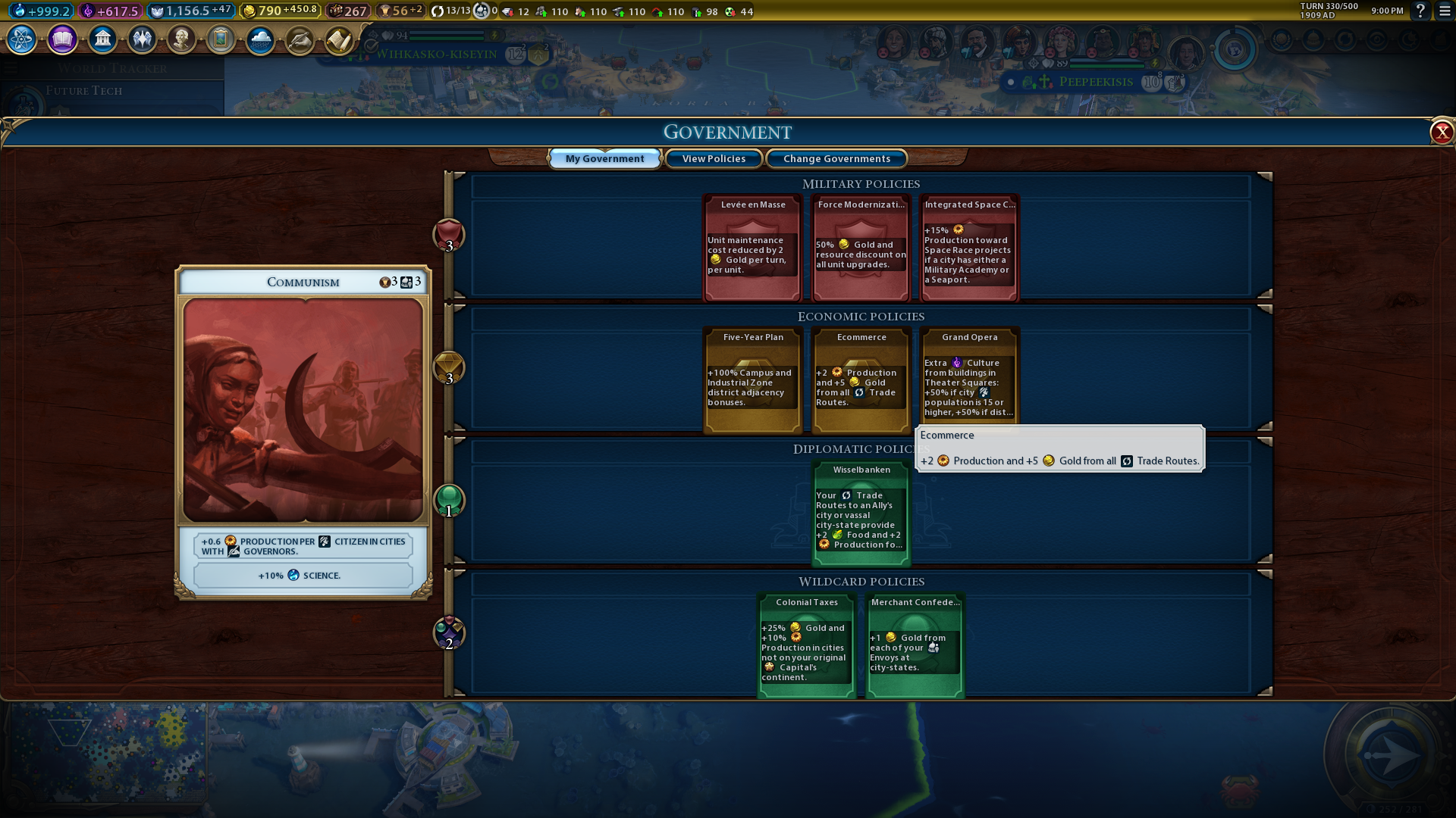 Try to establish one or two alliances when playing with the Poundmaker Civilization 6 leader to fully exploit his Favorable Terms bonus that will reveal more of the map. The shared map visibility from alliances will enable you to find more scientific city-states faster, where you can send envoys for boosting science output. Establish a Research Alliance that will generate a +2 science yield bonus for trade routes sent to your ally. Then, you can further enhance your allied trade routes by selecting the Wisselbanken policy for +2 production and +2 food trade yield increases.