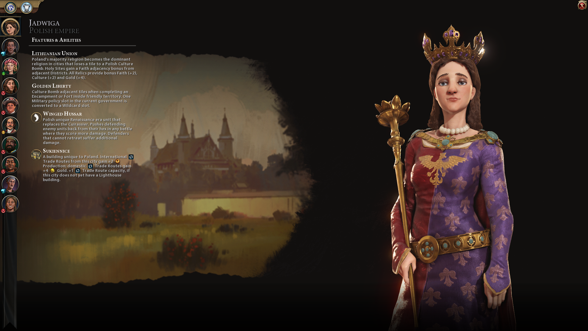 So, the Polish Jadwiga Civ 6 leader can be a good one for military domination if you effectively mix Culture Bombing and religion with war. Roll out the Winged Hussar cavalry to trample over your enemies in military campaigns. More peaceful players can exploit the Sukiennice productivity effect for trading to give space race project production a significant boost for securing scientific triumphs.