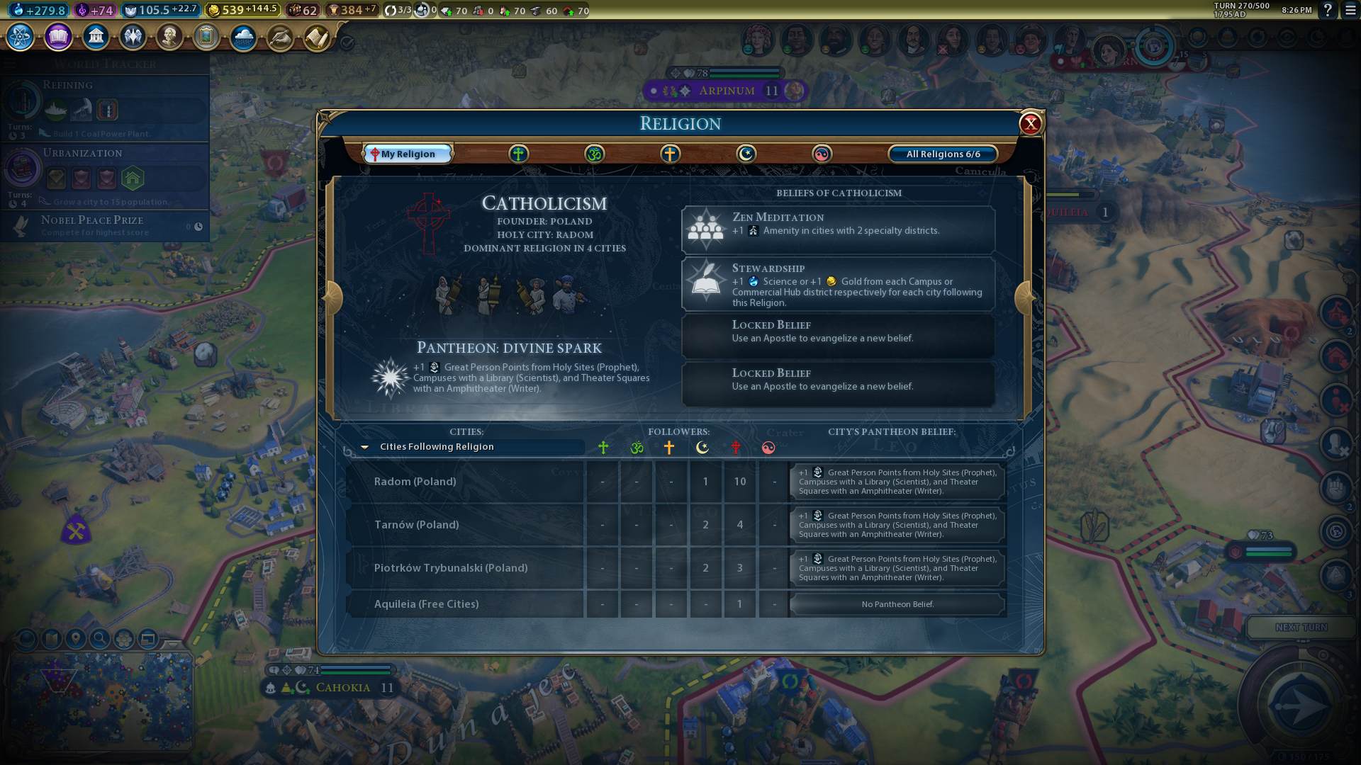 Make sure you establish a religion so that you can combine Poland’s religious effects with your military campaigns. To do that, select the Crusade belief for your religion that will give your units a +10 combat strength bonus when fighting units close to foreign cities that follow your religion. Then, you can exploit that Crusade belief by activating Culture Bombs that will convert foreign cities to your religion.
