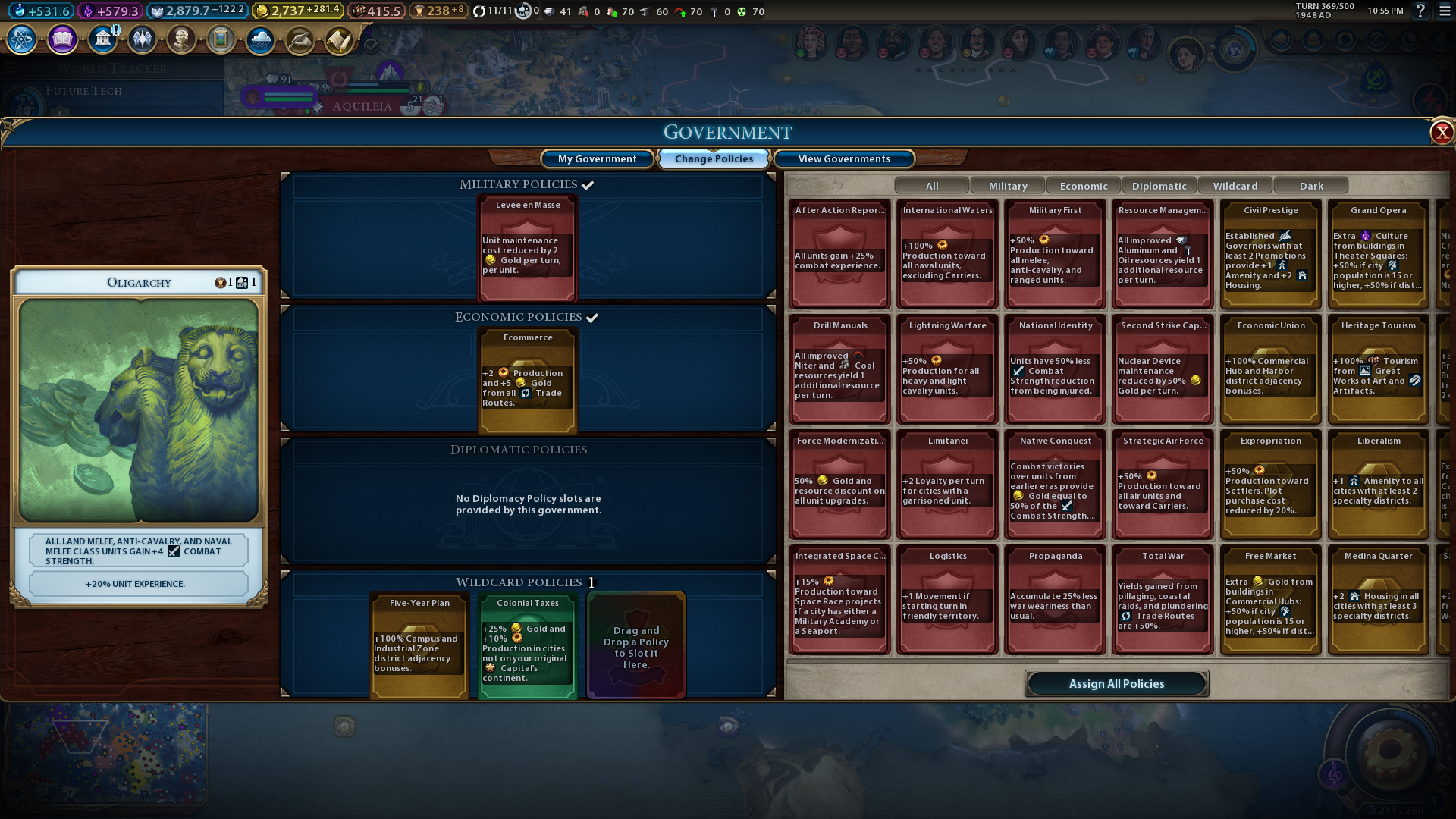 If you’re pursuing the Domination Victory path, Fascism is the best government you can select for that objective later in a game. Firstly, because it gives you four military card policy card slots, which is the most of any government. However, the best thing about Fascism from a military perspective is that it gives all your units a +4 combat strength bonus, which is invaluable for war. Fascism’s 20% unit production effect will also enable you to roll out more military units faster.