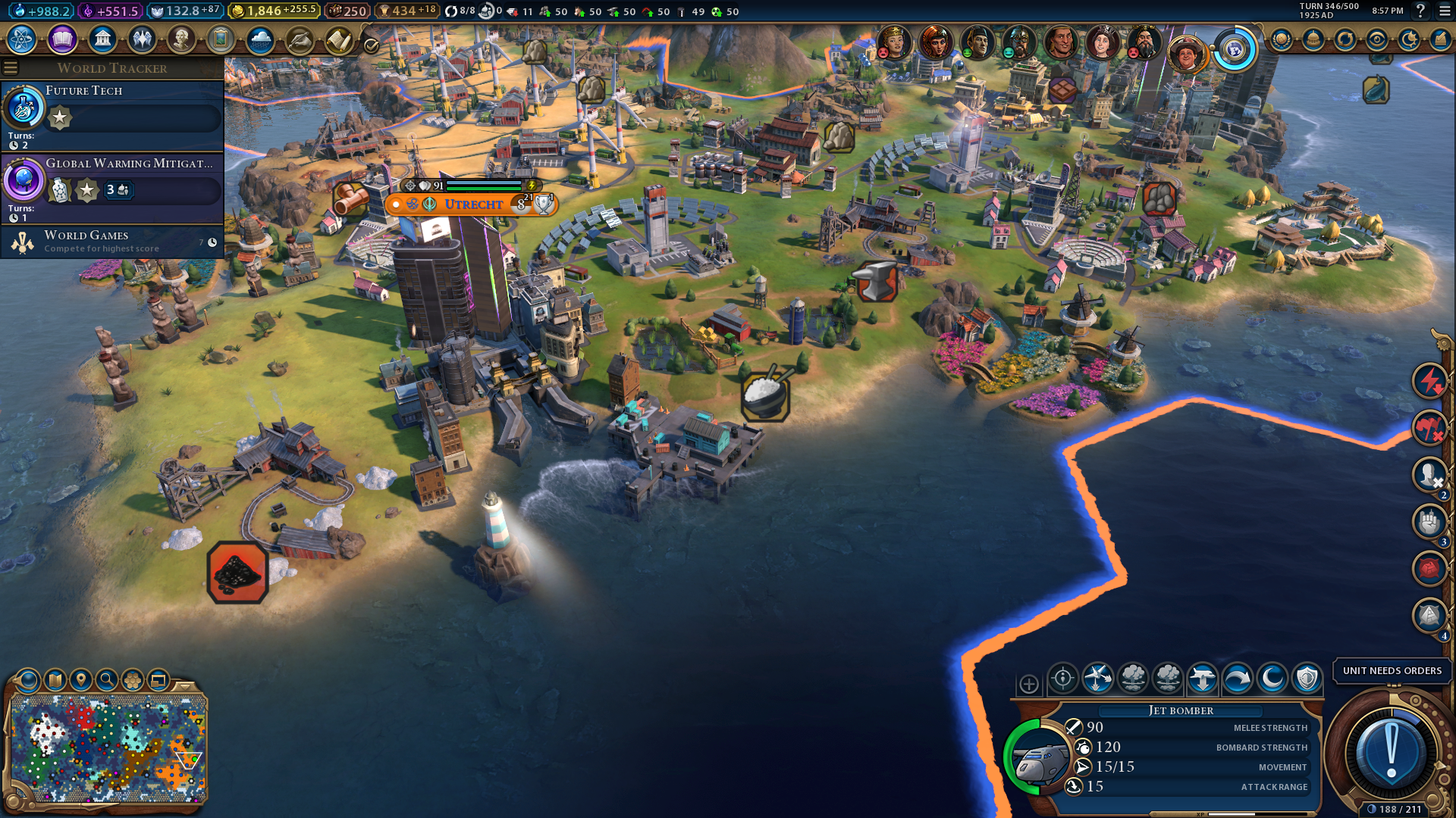 In Gathering Storm, the passing of a Border Control Treaty resolution (with your civilization selected as the target) in World Congress will enable you to trigger Culture Bombs. The Border Control Treaty enables the selected target player to trigger Culture Bombs by building districts. Thus, that treaty gives you a more flexible way to Culture Bomb because districts can be built on many tiles. However, that passed treaty comes with the caveat that cultural influence won’t expand the target player’s borders.