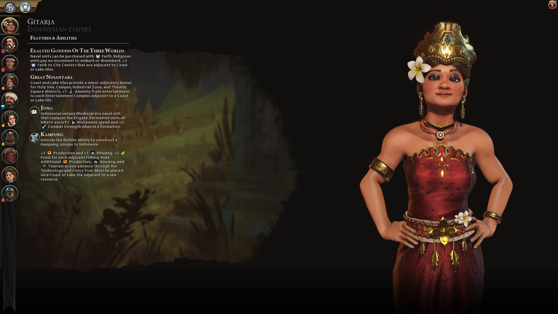 So, the Indonesian Gitarja Civ 6 leader can be a good choice for players seeking religious or cultural victories in Civilization 6. You can turbocharge your faith output for recruiting religious units, Naturalists, or cultural great persons with the Exalted Goddess leader bonus and Great Nusantara civ ability. Add the Kampung infrastructure to coastal tiles and build Entertainment Complexes to attract more tourists to your civilization for an Indonesian cultural victory. Whatever victory condition you aim for, you must establish a coastal civilization when playing with Indonesia.