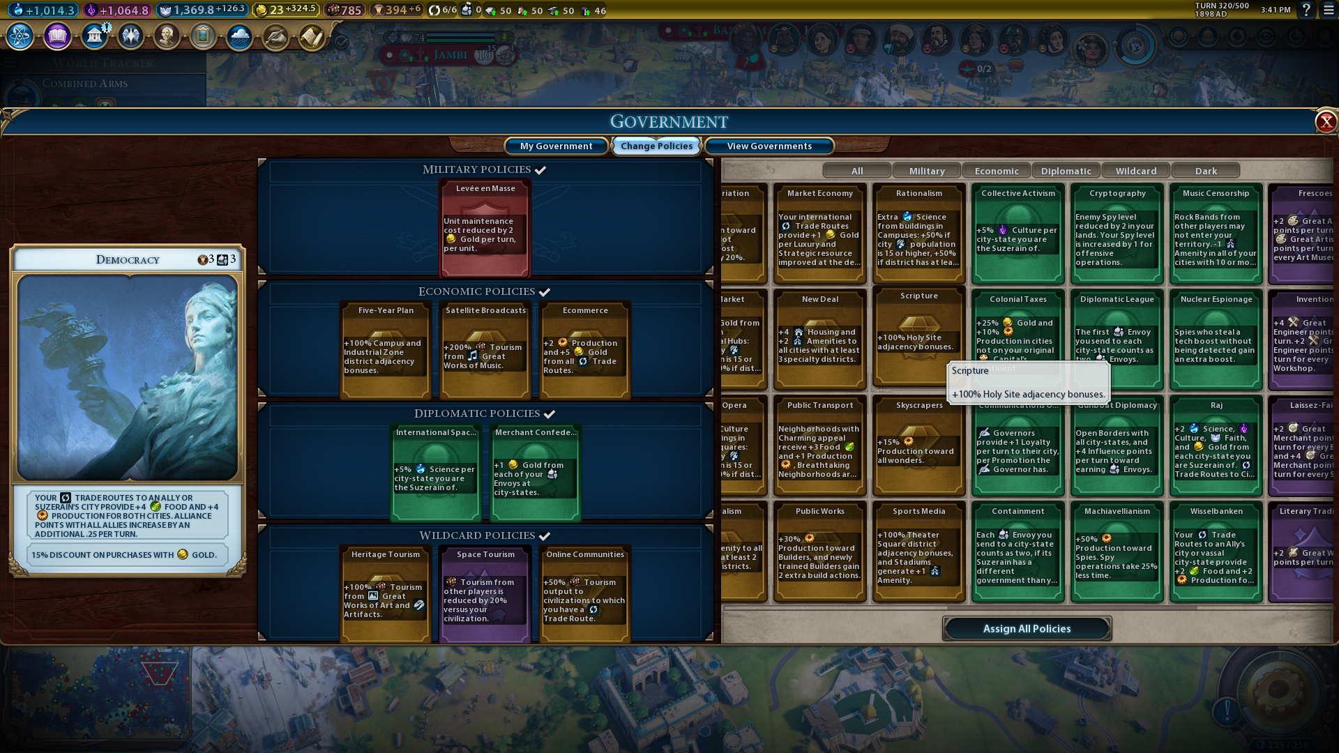 Placing most of your cities beside coastal or lake tiles will also enable you to fully exploit the Great Nusantara district adjacency bonus. If playing for a Religious Victory, place your Holy Sites alongside coastal or lake tiles to further boost faith output with the Great Nusantara civ ability. Then, select the Scripture policy card that will boost your Holy Site adjacency bonus by 100% to turbocharge the Great Nustantara district adjacency effect.