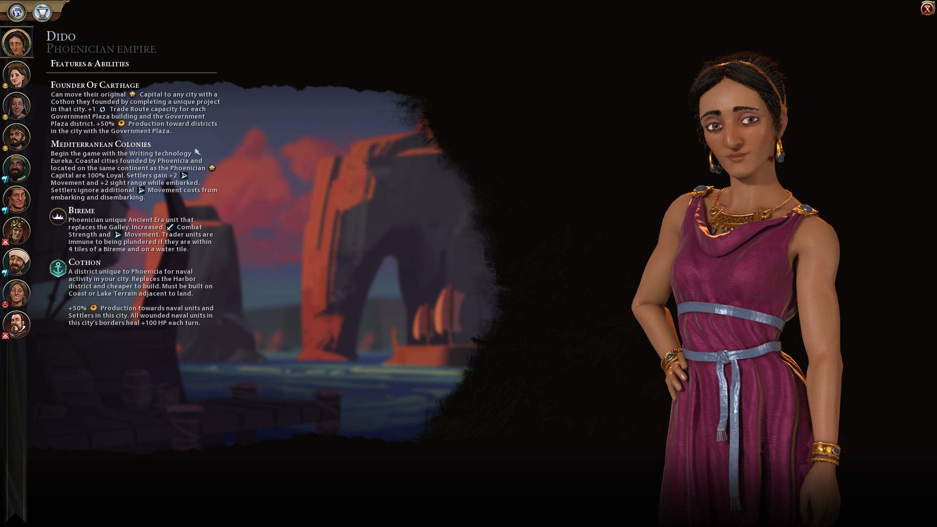Overall, the Phoenician Dido Civ 6 leader is an economically strong one, with her Founder of Carthage bonus and unique Cothon district. If you fully exploit trade for increasing science and production yields in cities with Spaceports, you can cruise to a space race victory when playing as Dido. Alternatively, adopt a naval-oriented military strategy for defeating other civilizations with your navy to secure a Domination Victory. Whatever victory condition you play for as Phoencia, your strategy should be based on the Plaza and Cothon districts for expanding trade, governor appointment and promotion, fast recruitment of settlers, and rapid naval mobilization.