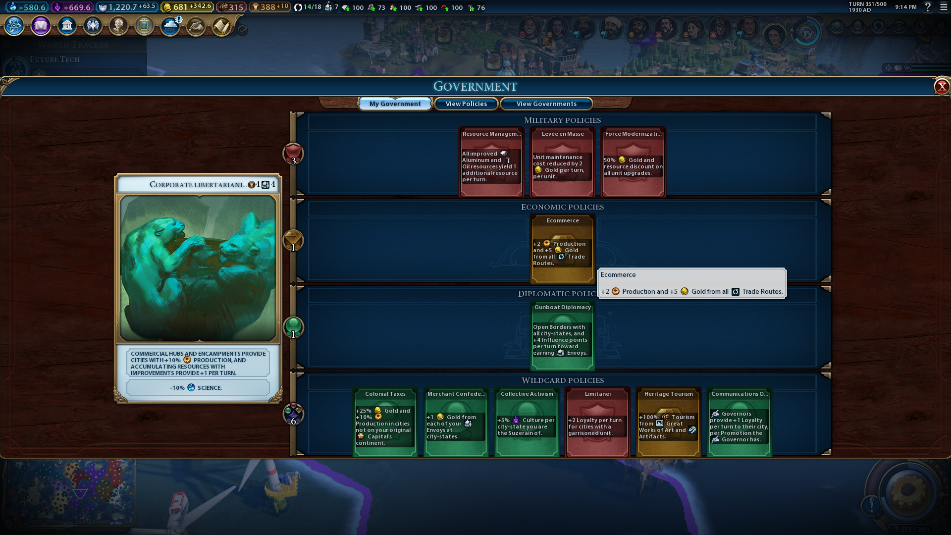 Building many Cothons also enables you to expand your trade routes with Lighthouses. To expand your trade even more, prioritize building a Plaza district and its buildings. Then, exploit your trade routes to boost scientific output for winning a space race by selecting the Trade Confederation and Market Economy policy cards that generate +1 and +2 science yields for international trade routes. Select the Ecommerce policy card later in a game, which gives your international trade routes +2 production yields, to increase productivity in cities that include Spaceport districts.