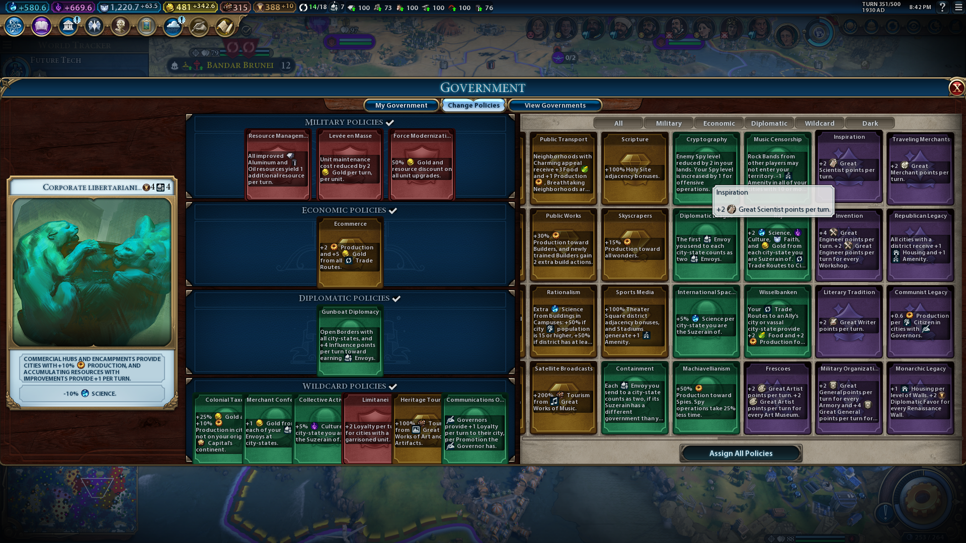 There are a variety of wildcard policies you can select to increase great person points generation in Civilization 6. Literary Tradition, Frescoes, Revelation, Navigation, Traveling Merchants, and Invention are all policy cards that generate +2 GPPs per turn for specific types of great people. Or select the superior Nobel Prize, Science Foundations, Military Organization, and Laissez-Faire policy cards that generate +4 GPPs per turn. Selecting such cards when you can do so is one of the easiest ways to attract more Civ 6 great people to your civilization.