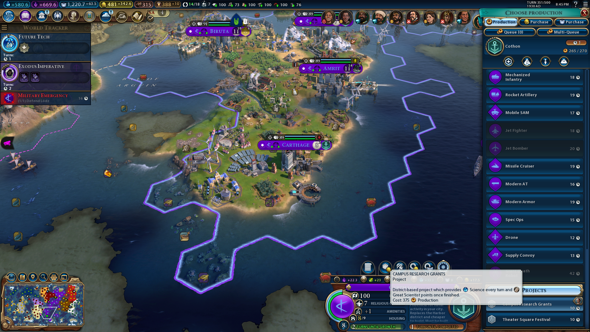 City district projects can be a good way to increase GPP generation for attracting more great people who shouldn’t be overlooked. For example, you can select Commercial Hub Investment, Industrial Zone Logistics, Campus Research Grants, and Theater Square Festival in cities that include the required districts for those projects. Those projects generate additional great person points for your civilization when completed (typically amounting to 22% of the production invested in them).