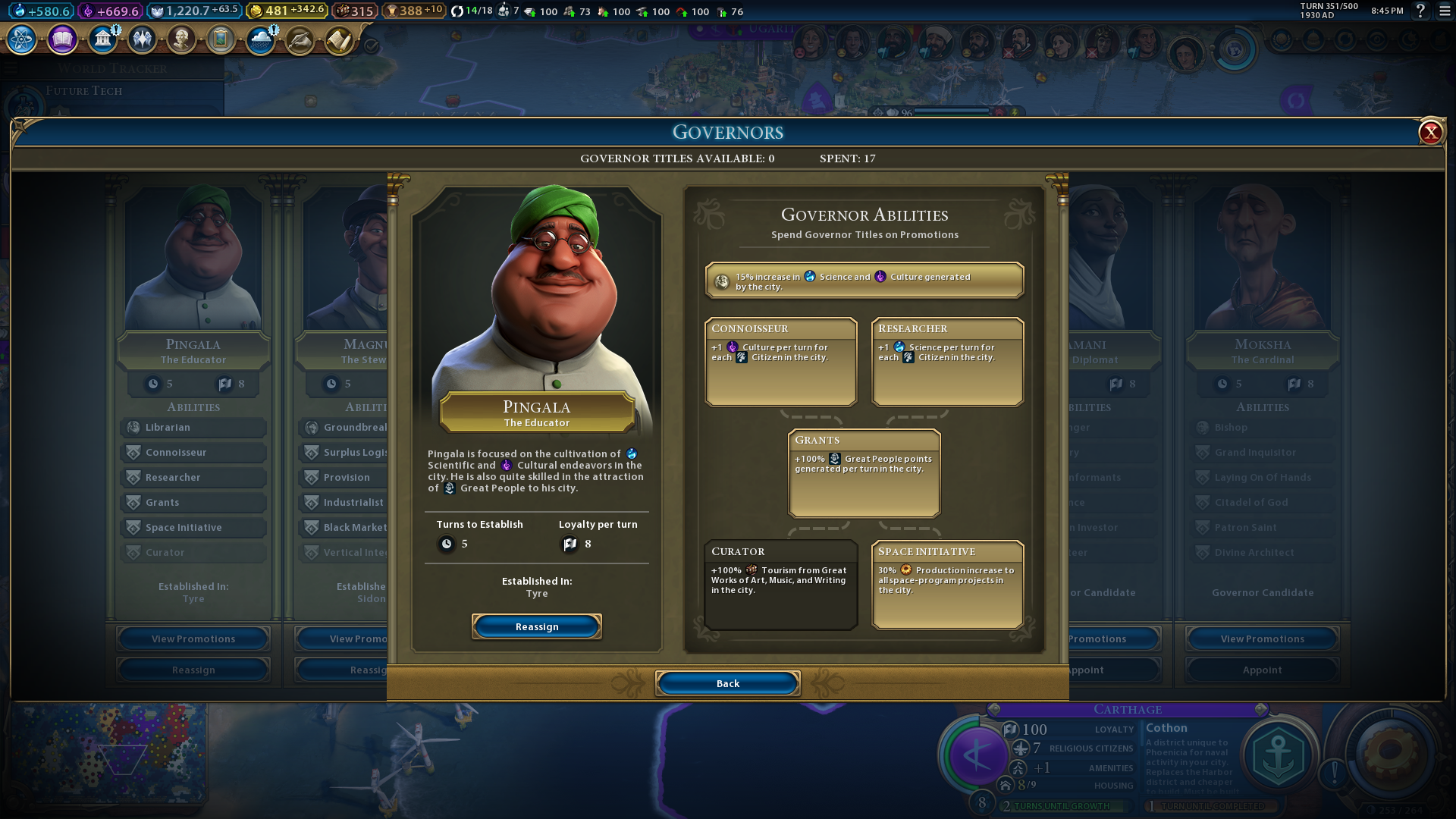 Then, appoint the Pingala governor and station him in the city that includes the Oracle Wonder. Select Pingala’s Grant’s promotion when he’s in the city that includes the Oracle. His Grants promotion will double all the great people points generated in the city that has the Oracle wonder.