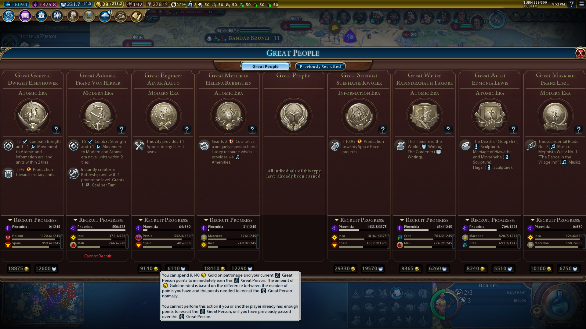 Patronage is an alternative way to attract Civ 6 great people beyond points generation. That is effectively a type of grant that enables you to purchase great persons with gold or faith, via the great person screen. The amount of gold or faith needed for purchasing great persons in this way falls as you accumulate more points for them. Thus, saving gold and faith for the patronage of great persons is a good way to attract them to your civilization sooner rather than later. That’s especially the case when you’re behind other civilizations in reaching a required great person’s points total.
