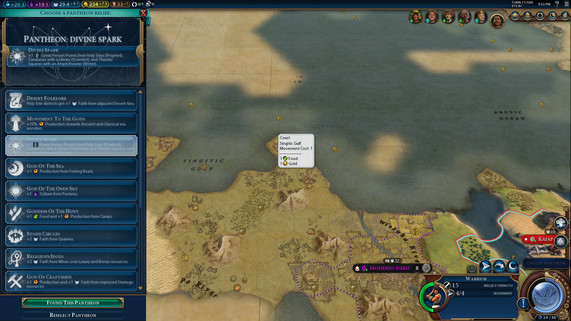 Divine Spark is one of my favorite Civilization 6 pantheons because of the extra GPPs it generates for cultural, prophet, and scientific great persons. The Divine Spark pantheon generates +1 great person point per turn from Campus, Theater Square, and Holy Site districts. However, note that in Gathering Storm Campus and Theater Square, the districts must include the Amphitheater and Library buildings. If you’re playing for a culture or scientific victory, selecting Divine Spark is a good pantheon to select for attracting more scientists and cultural great persons to your civilization.