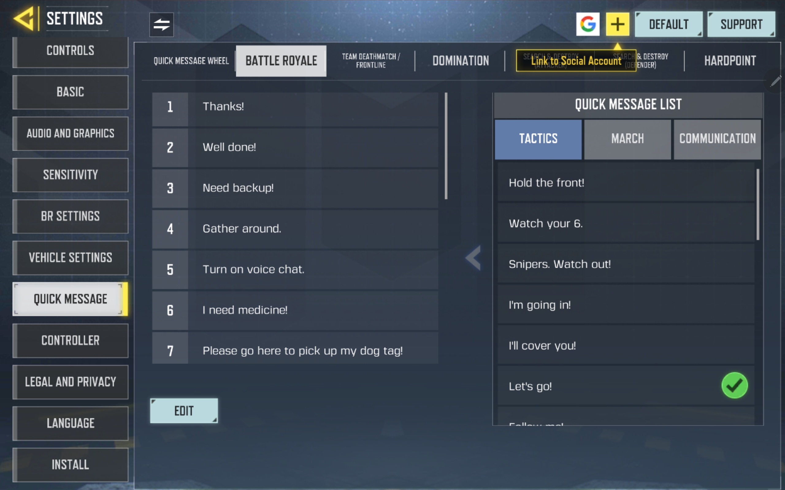 You can also customize the chat options by adding more messages to them. To do so, tap the menu button at the top right of COD Mobile and select Settings. Then, tap the arrow button to access the second settings menu screen. Select the Quick Message and Battle Royale tabs. Finally, select Edit to add more message options to your list.