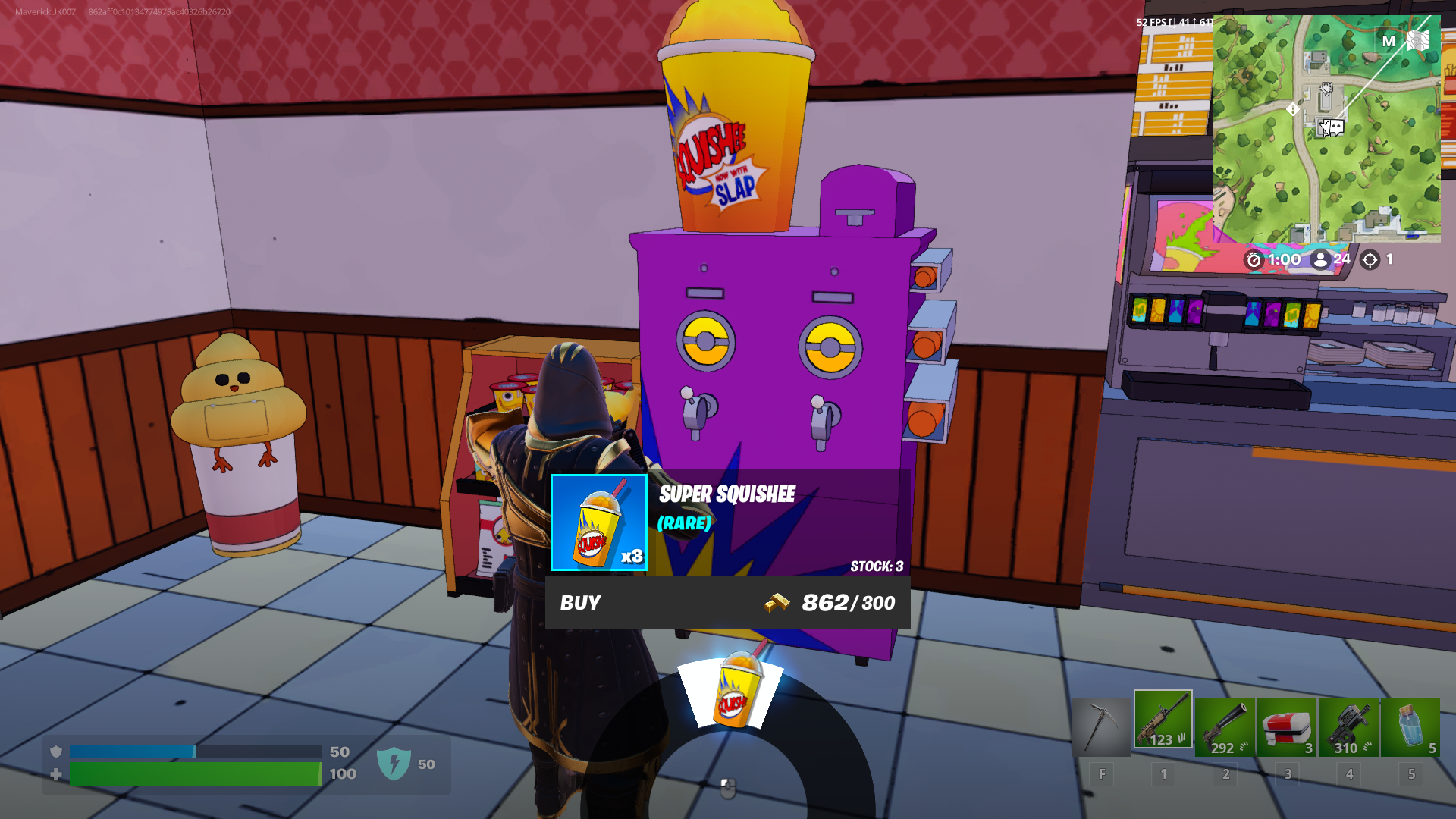 There are some new weapons and items to pick up in Fortnite Simpsons. Players can pick up and eat Krusty Burgers for health and shield regeneration. Drinking the Super Squishe regenerates health and shield, and also gives you a temporary speed boost. Or gobble up a Blinky Fish that replenishes health and shield and grants a temporary dash ability.