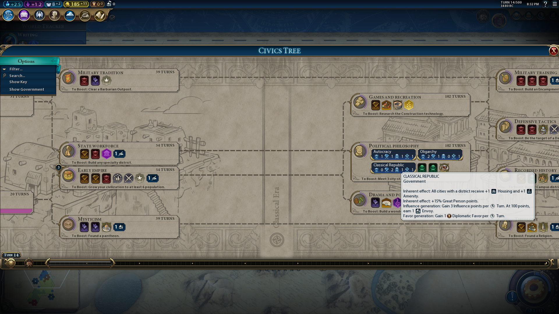 Political Philosophy is one of the most important early game civics to unlock because it gives you a selection of governments. Unlocking Political Philosophy unlocks the Autocracy, Classical Republic, and Oligarchy governments. All of those governments are significantly better than the Chiefdom you start with, enabling you to select four policy cards rather than two. So, Political Philosophy is a civic you should prioritize unlocking in the early game, not least because a requirement for it is Early Empire, which unlocks the Colonization card.
