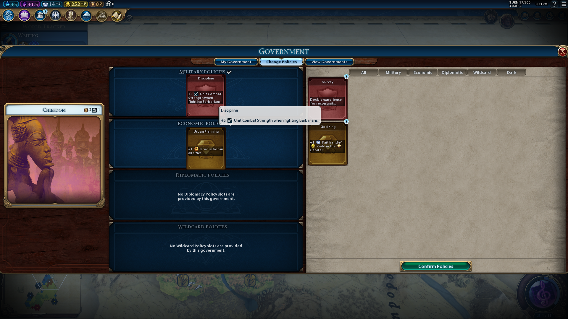Thus, it’s better to deal with nearby barbarian camps soon rather than later during the early game period. The best way to eliminate barbarians during the early game is to select the Discipline policy card. That card will give you a +5 combat strength bonus when fighting barbarians. When combined with unit promotions, you can flush out barbarians’ camps somewhat more efficiently with that card selected.