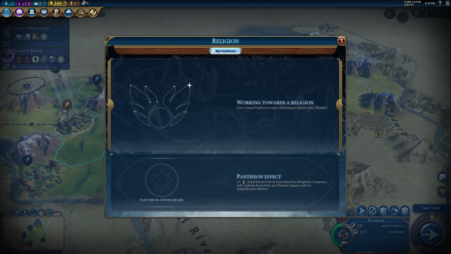 Even if you’re not bothered about establishing a religion, a Pantheon is always something you should try to claim with faith output during the early game. A Pantheon is a religious structure with a bonus effect for your civilization when claimed. However, they’re only available to claim during the early game. So, build a Holy Site during the early game, if necessary, to ensure you can claim a Pantheon. These are some of the better Pantheons to select during the early game period: