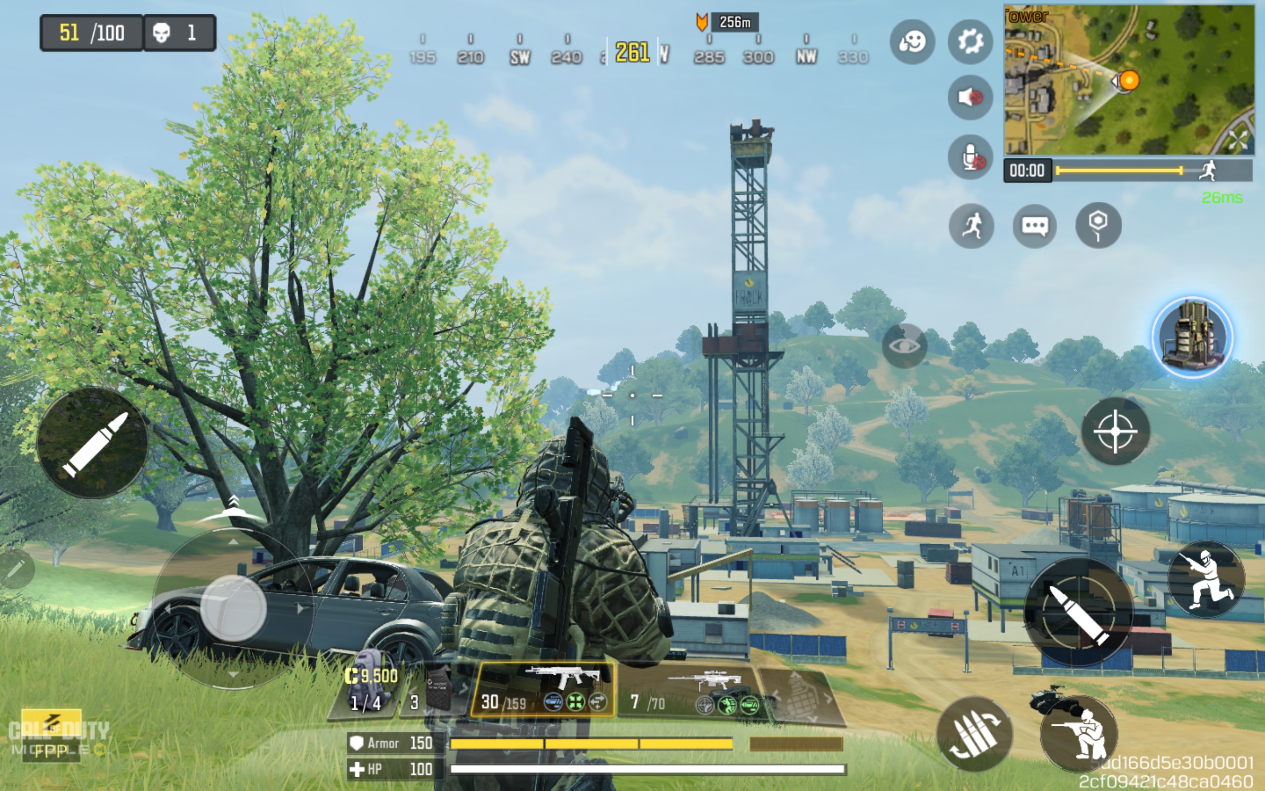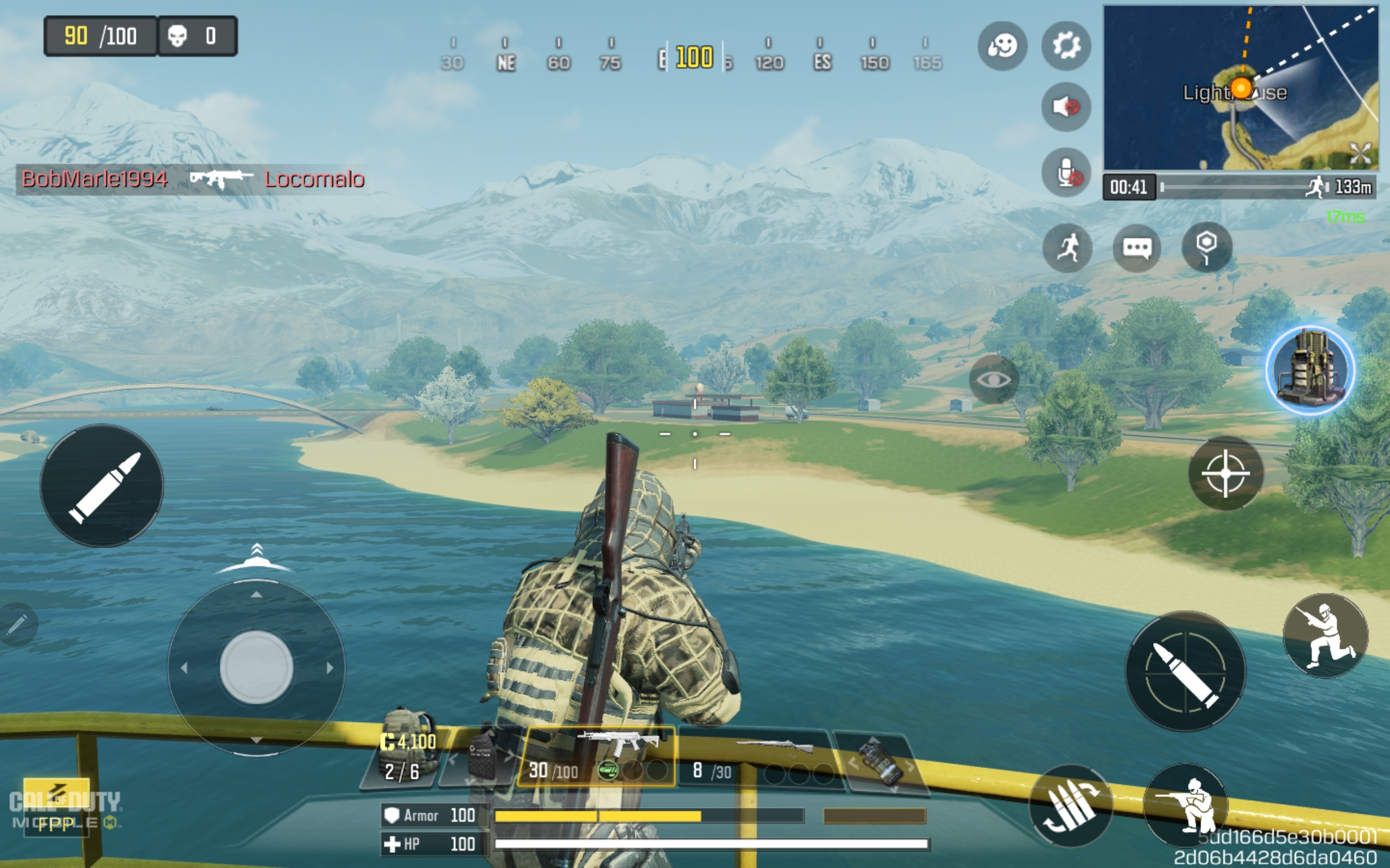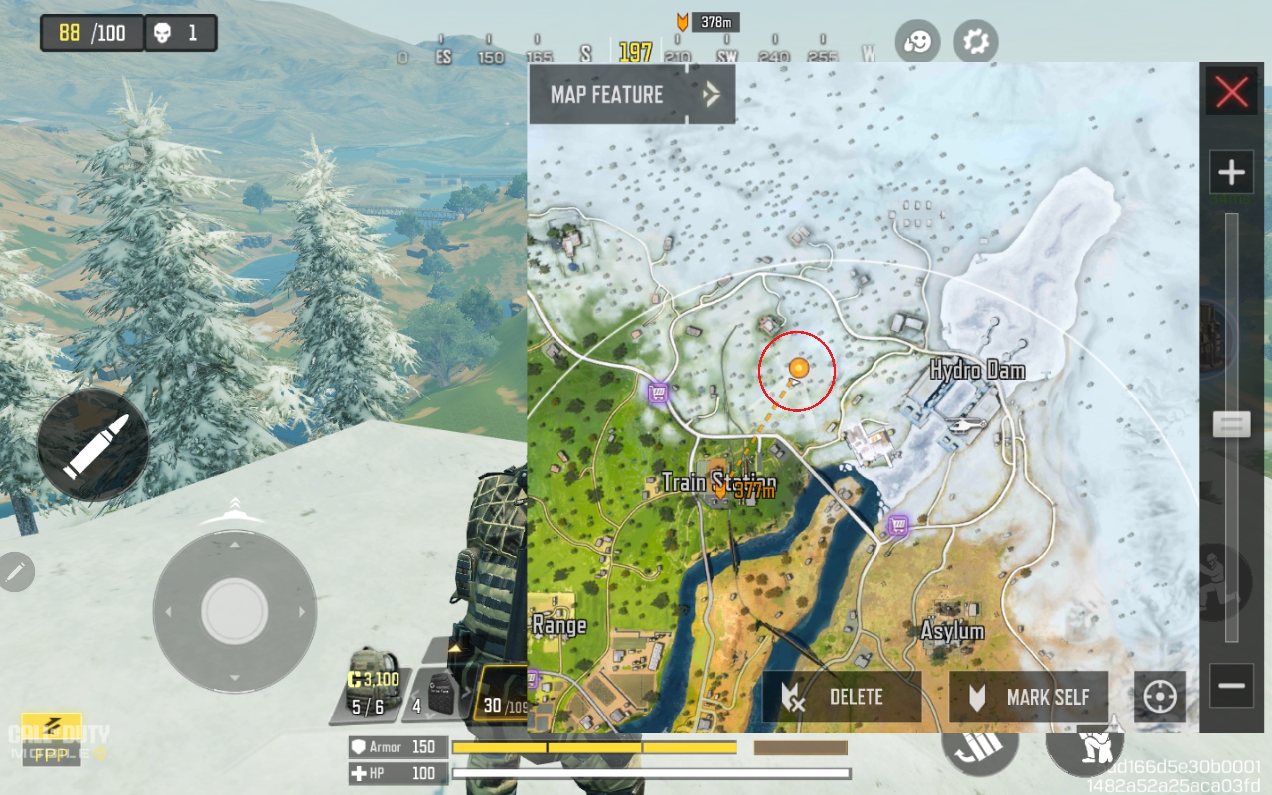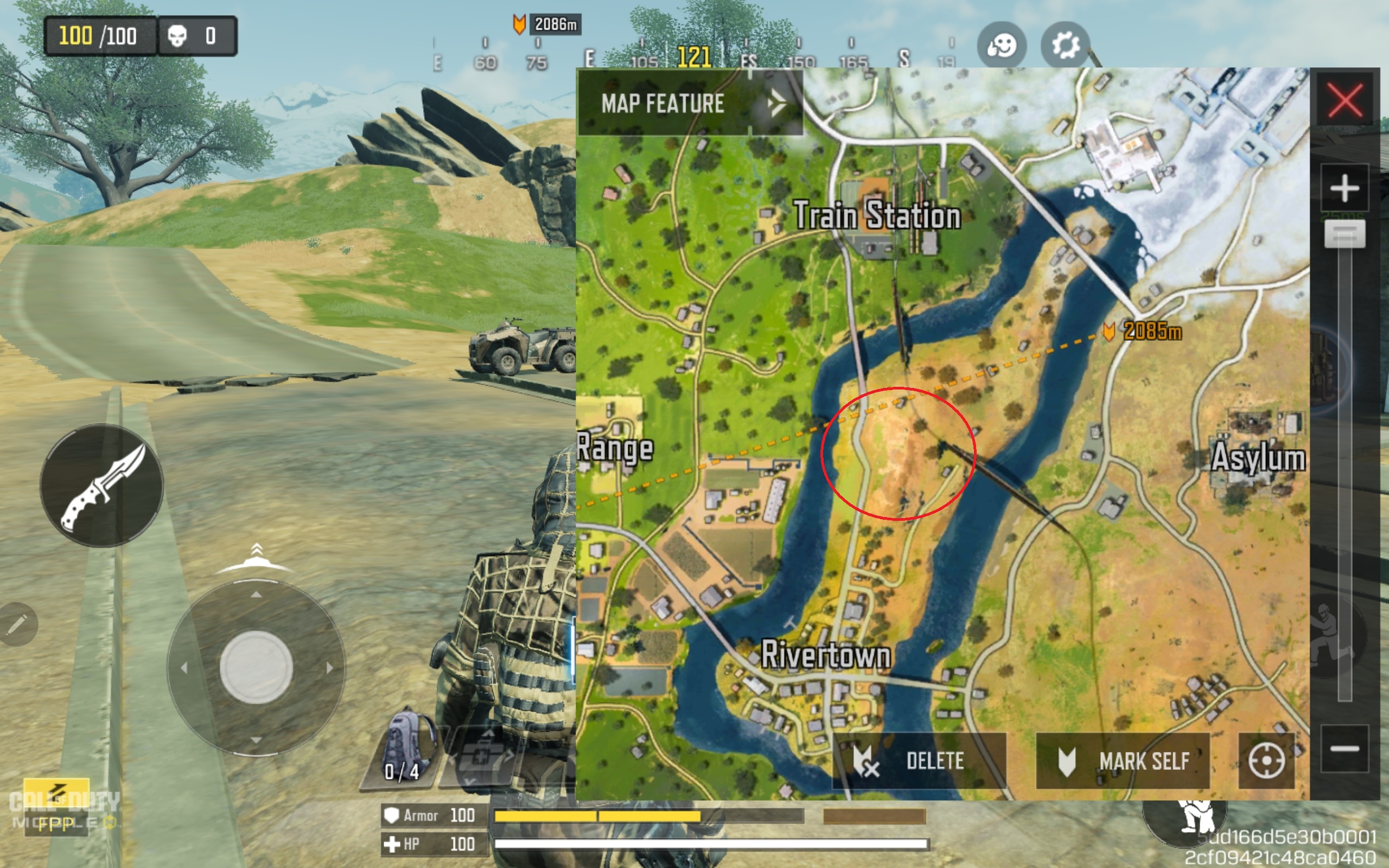 Rivertown is on an island connected by several bridges close to the approximate center of Blackout. The high hill area circled in the screenshot below, just north of Rivertown, is some of the best elevated landscape for COD: Mobile sniping on Blackout. What I like about this sniper spot is that it offers a good view of three bridge crossing points from which to target players. It also provides a great view of the landscape area between the Train Station and the Firing Range from one side.