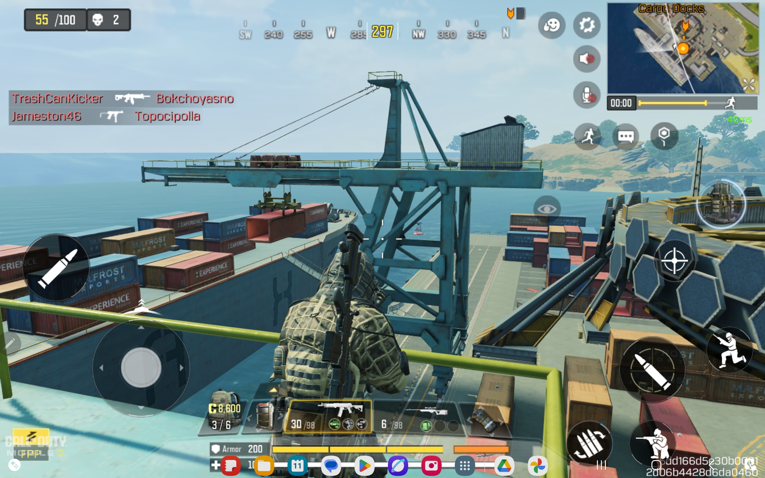 Cargo Docks also has other high structures that provide good sniping vantage points. For example, you can see a lot by standing atop the bridge deck of the large cargo ship adjacent to the gantry cranes. A high, circular structure in the center of the dock, which you can get on top of by utilizing Airborne or Ninja Crane, also provides another good viewing point to shoot down at players.