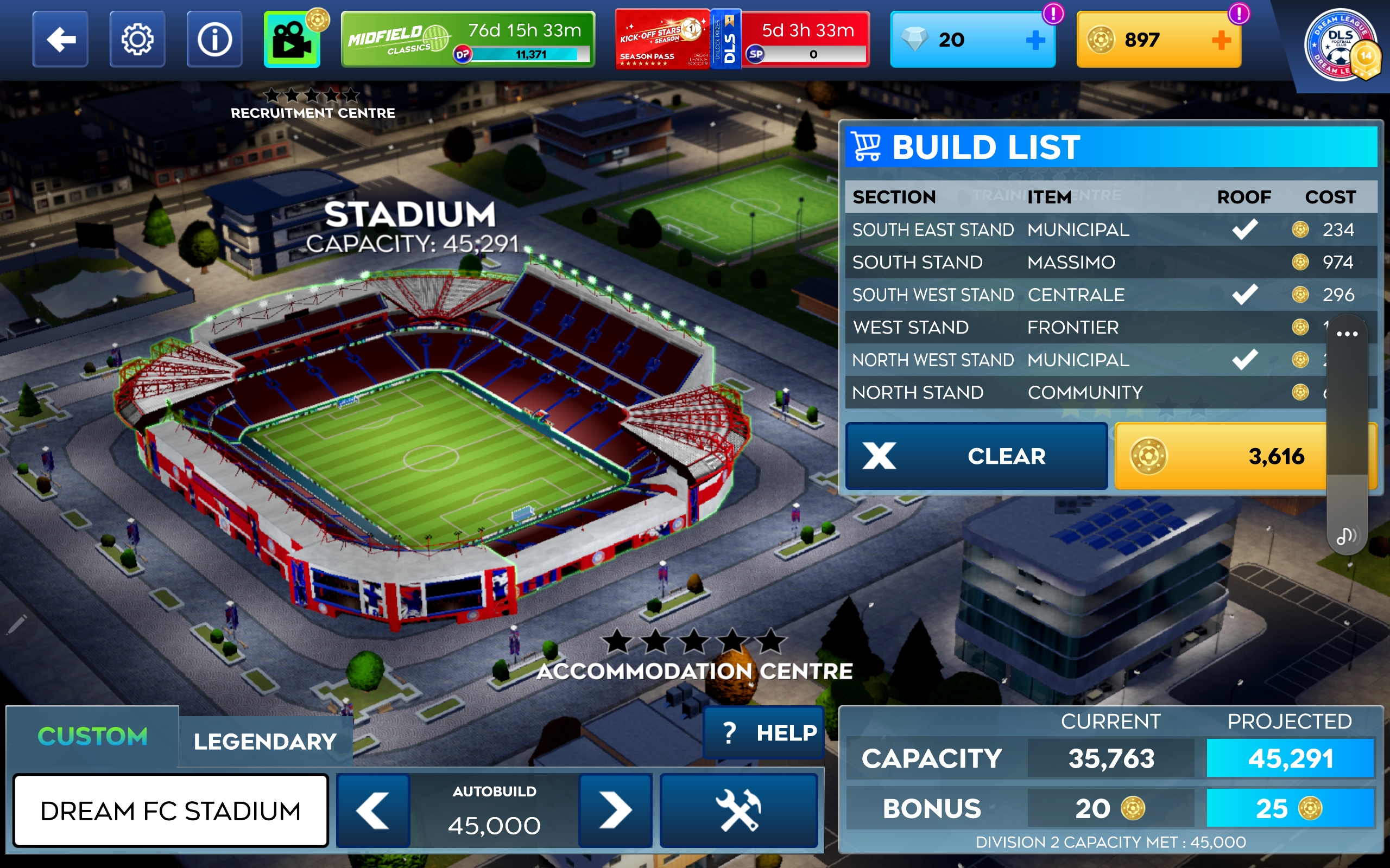 You should also prioritize expanding your stadium capacity over other ground upgrades for two reasons. Firstly, because you can’t get promoted if your ground doesn’t meet the minimum size requirement for the division above you. Secondly, because a larger stadium will generate more coins per a game. Thus, expanding stadium capacity is the best way to increase your club’s budget, which will help you purchase better players in the transfer market.