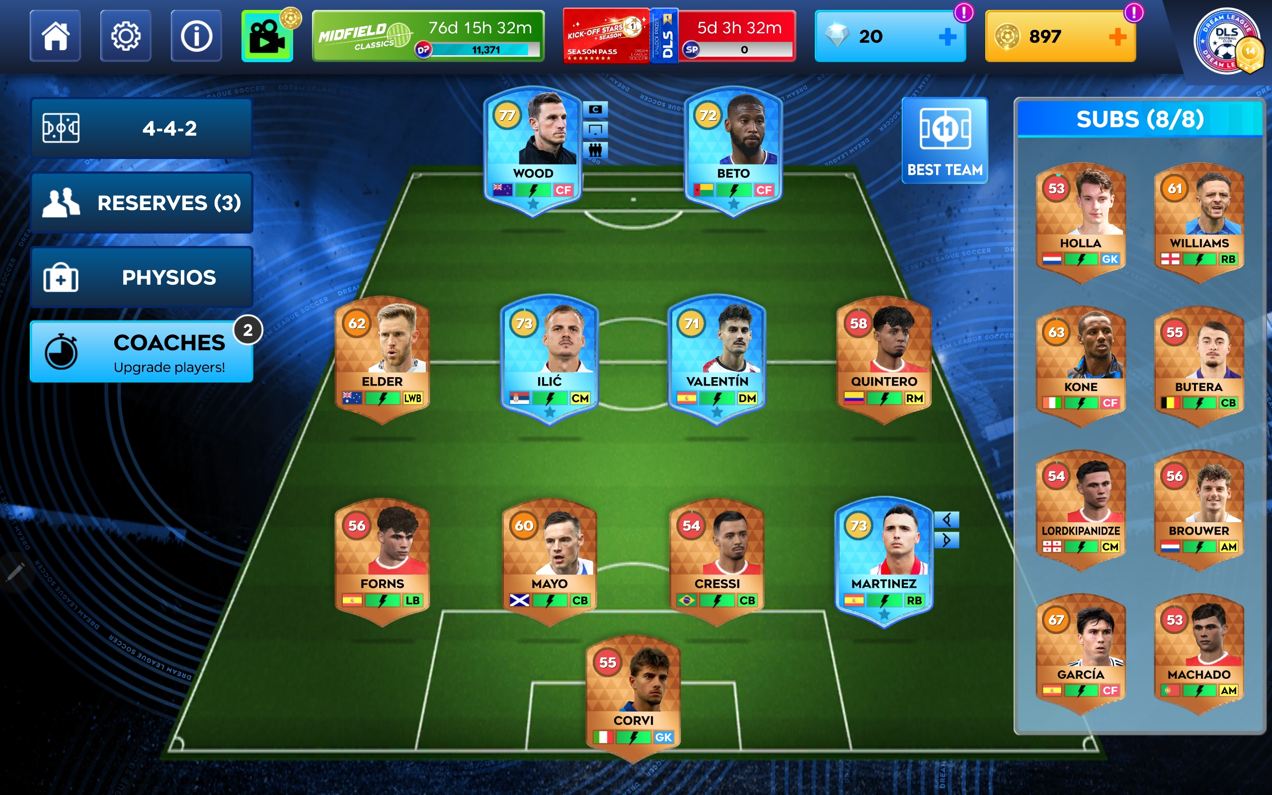 You can rotate your squad by selecting fresh players from your reserves and substitutes bench before matches start. Substitute tired players at half-time or after the intervals to bring on fresh legs during matches. This regular rotation of players will keep your squad generally fresher for matches.