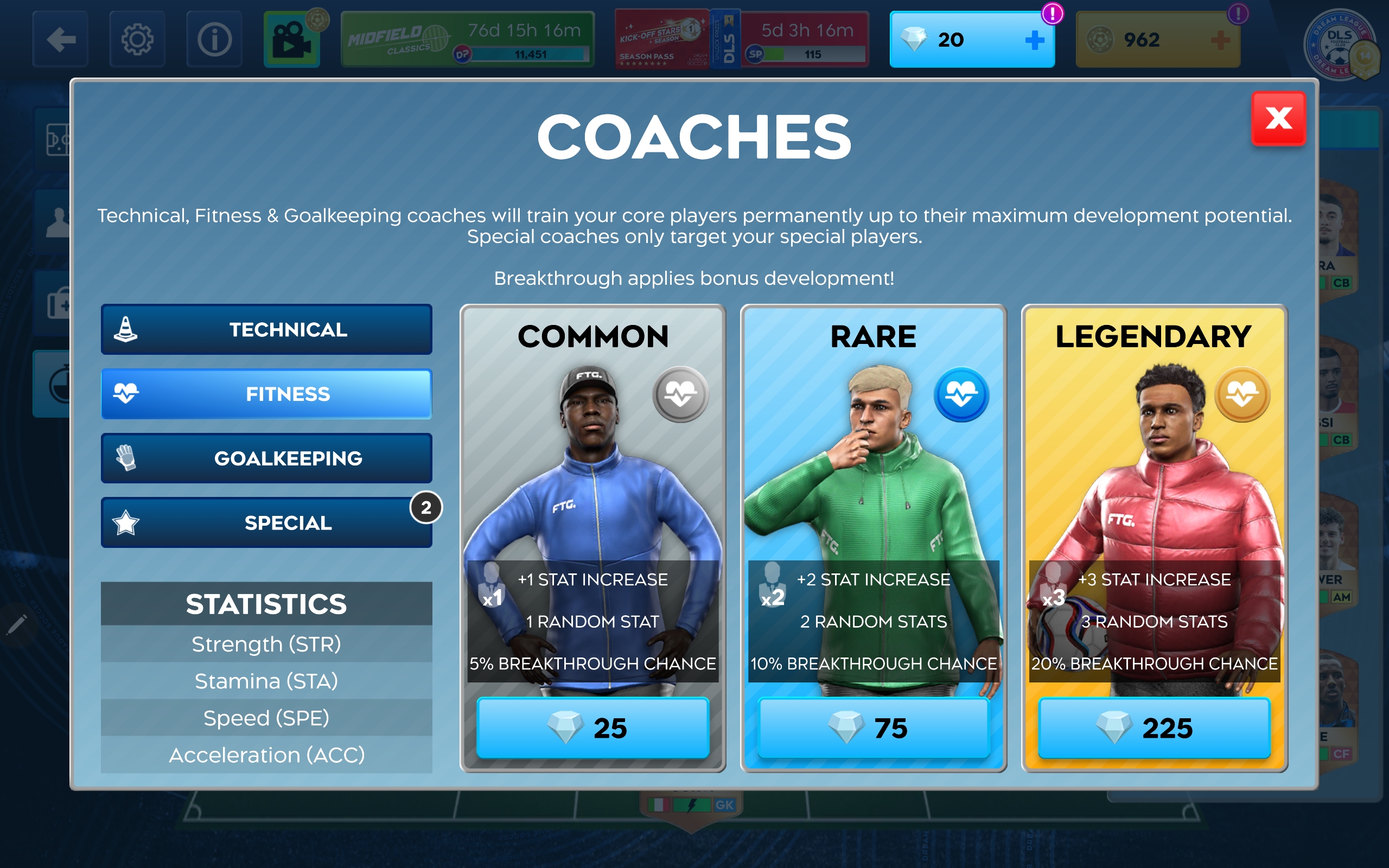Players can choose between fitness and technical training for coaching players. The fitness attributes of stamina, speed, and strength are crucial in the Dream League Soccer game. With higher speed, your players will reach more 50/50 first during matches. Greater stamina will also reduce energy depletion, enabling your players to maintain peak performance intensity for longer. So, it’s better to invest more coins and gems in fitness training over technical to boost the speed and stamina of your team.