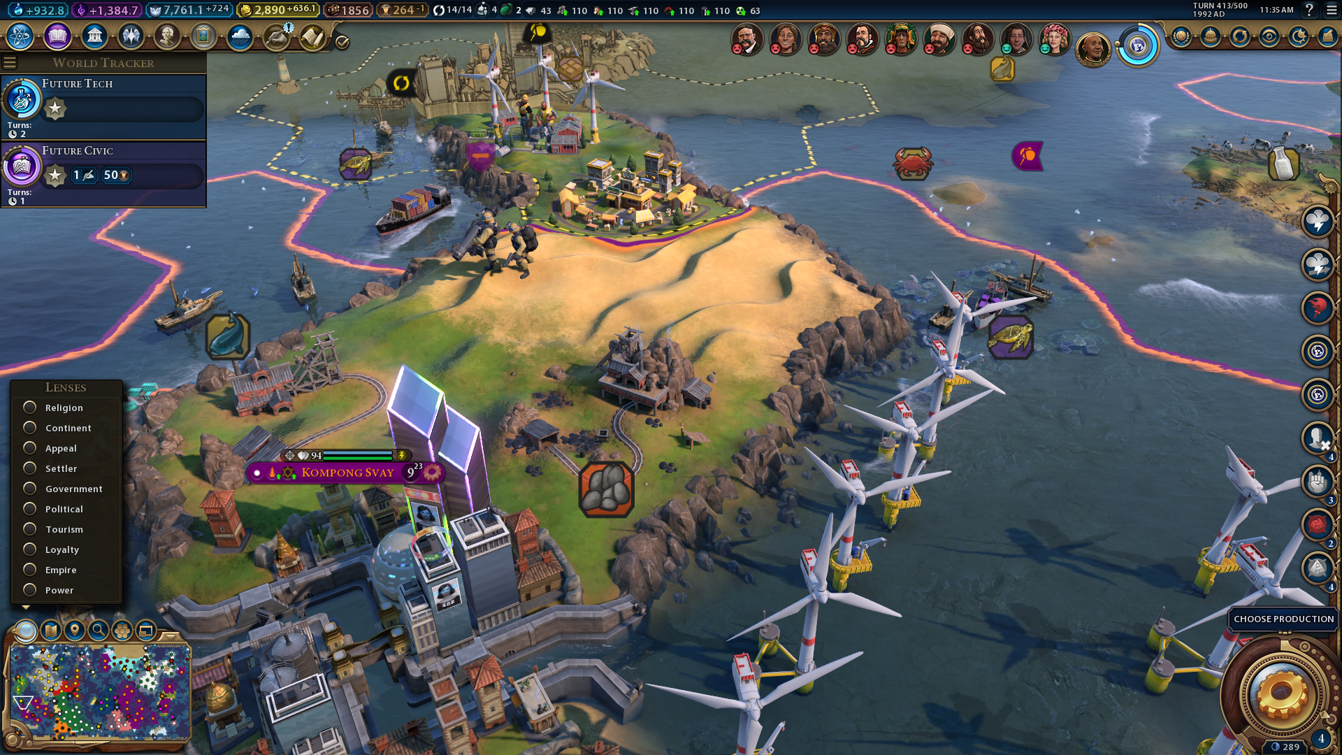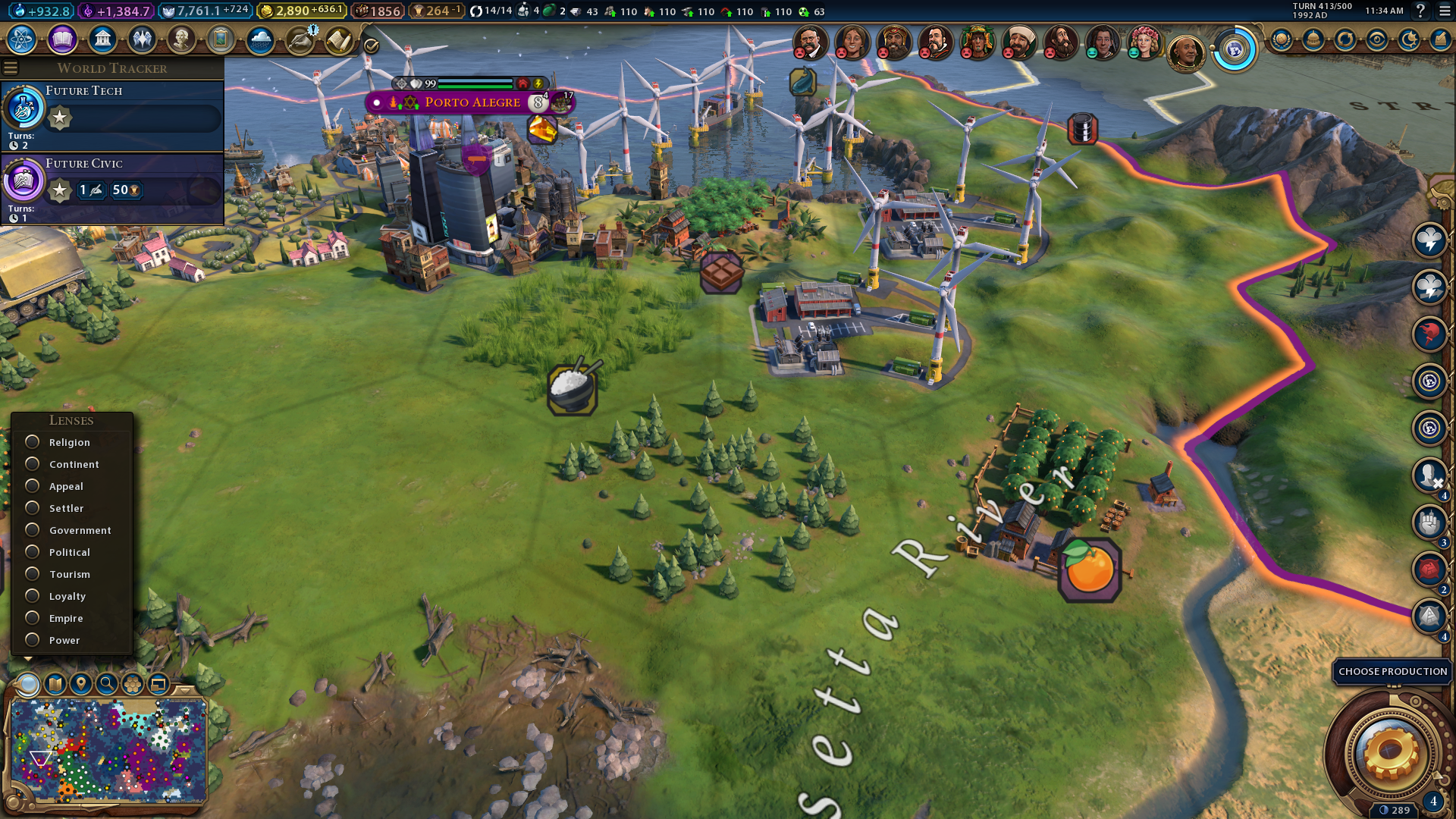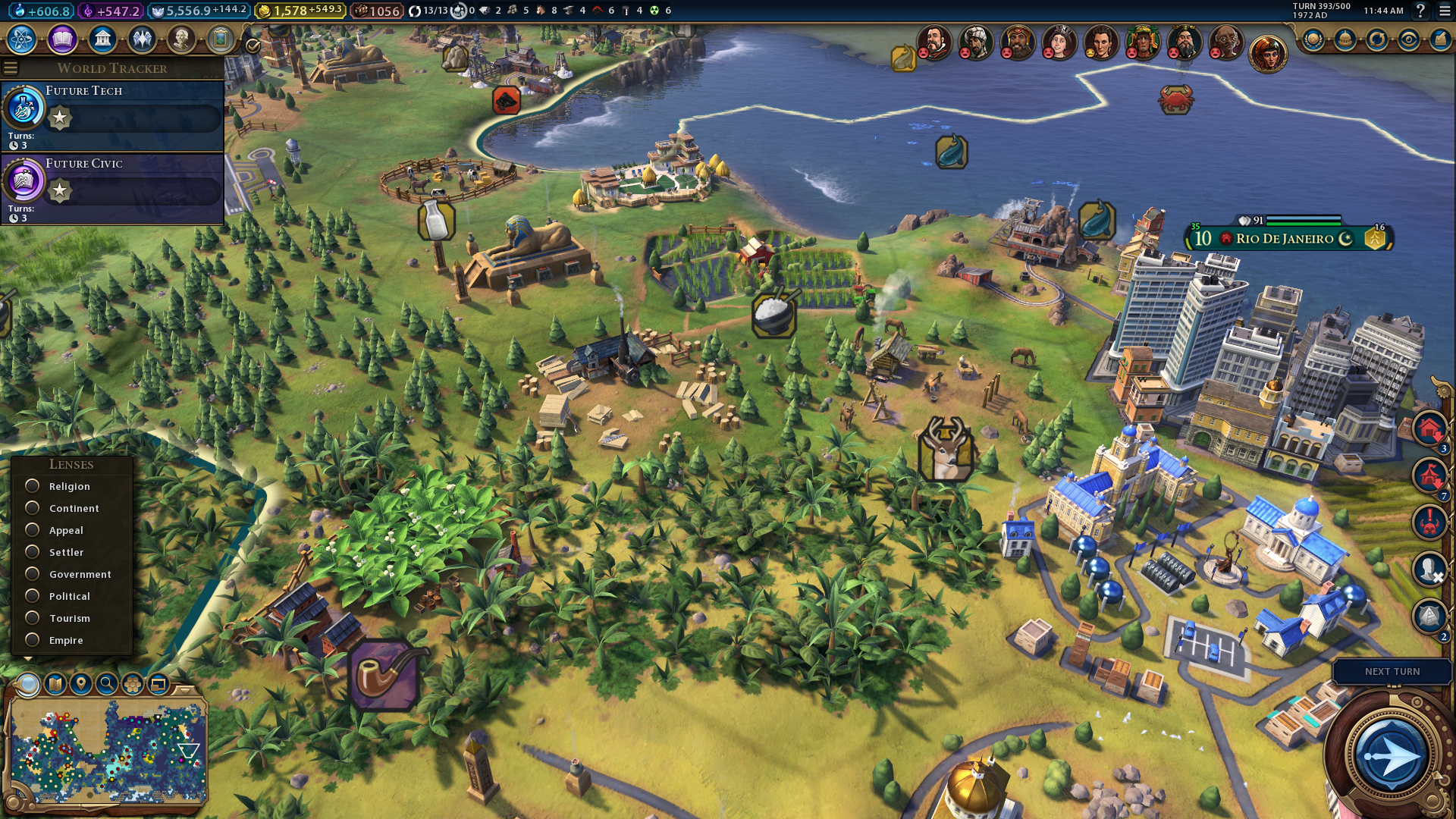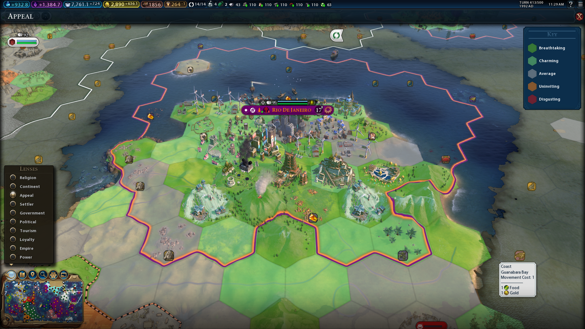 You can view the appeal ratings for all tiles within your civilization by selecting the map filter for it. Click the magnifying glass button above the map and select Appeal. Then, you’ll see the breathtaking, charming, average, uninviting, and disgusting tiles within civilization highlighted with different colors. Increasing the Civ 6 appeal ratings of average tiles might enable you to add more Seaside Resorts and National Parks to your civilization.
