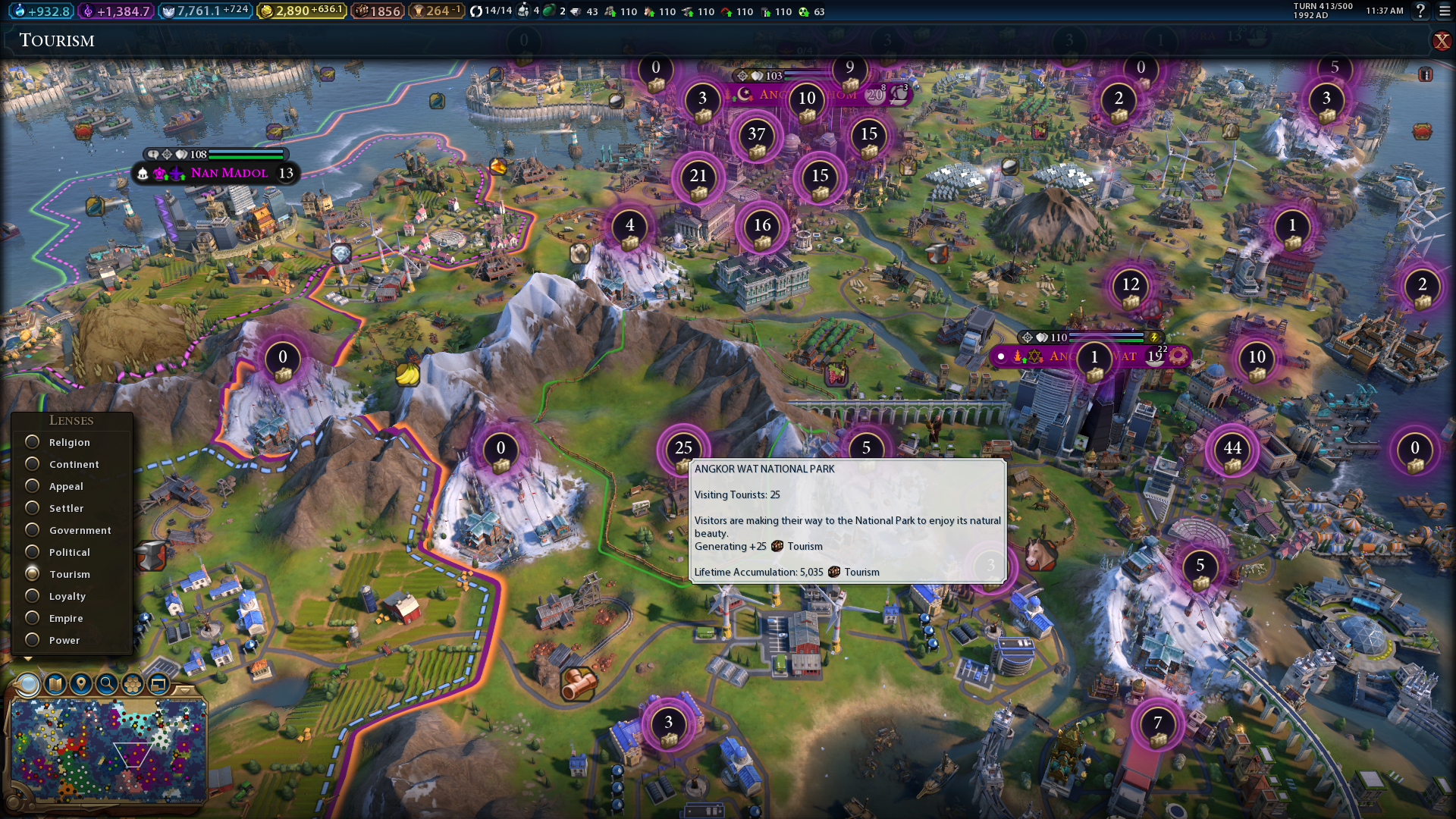 Tile appeal is most important to National Parks and Seaside Resorts. Players can only add National Parks and Seaside Resorts to tiles with charming or breathtaking Civ 6 appeal ratings. National Parks can generate a significant amount of tourism based on the total Civ 6 appeal value of all four tiles included within them. Seaside Resorts also generate gold and tourism based on their tile appeal ratings. Thus, National Parks and Seaside Resorts attract more visitors when you increase the Civ 6 appeal ratings of their tiles.