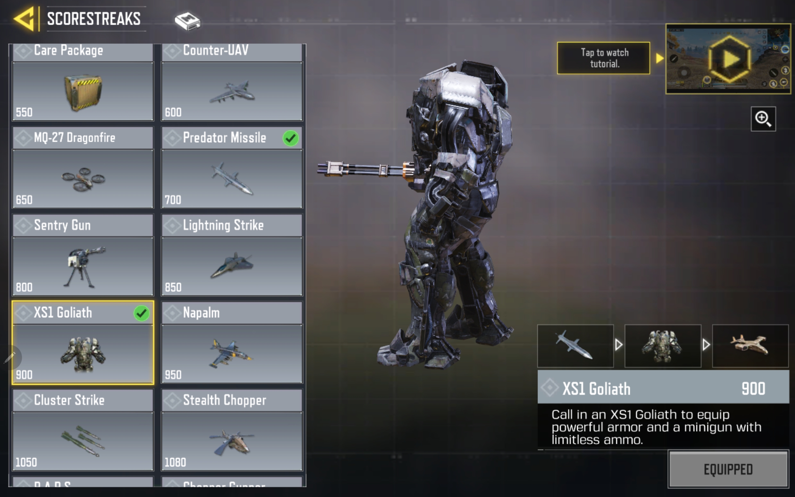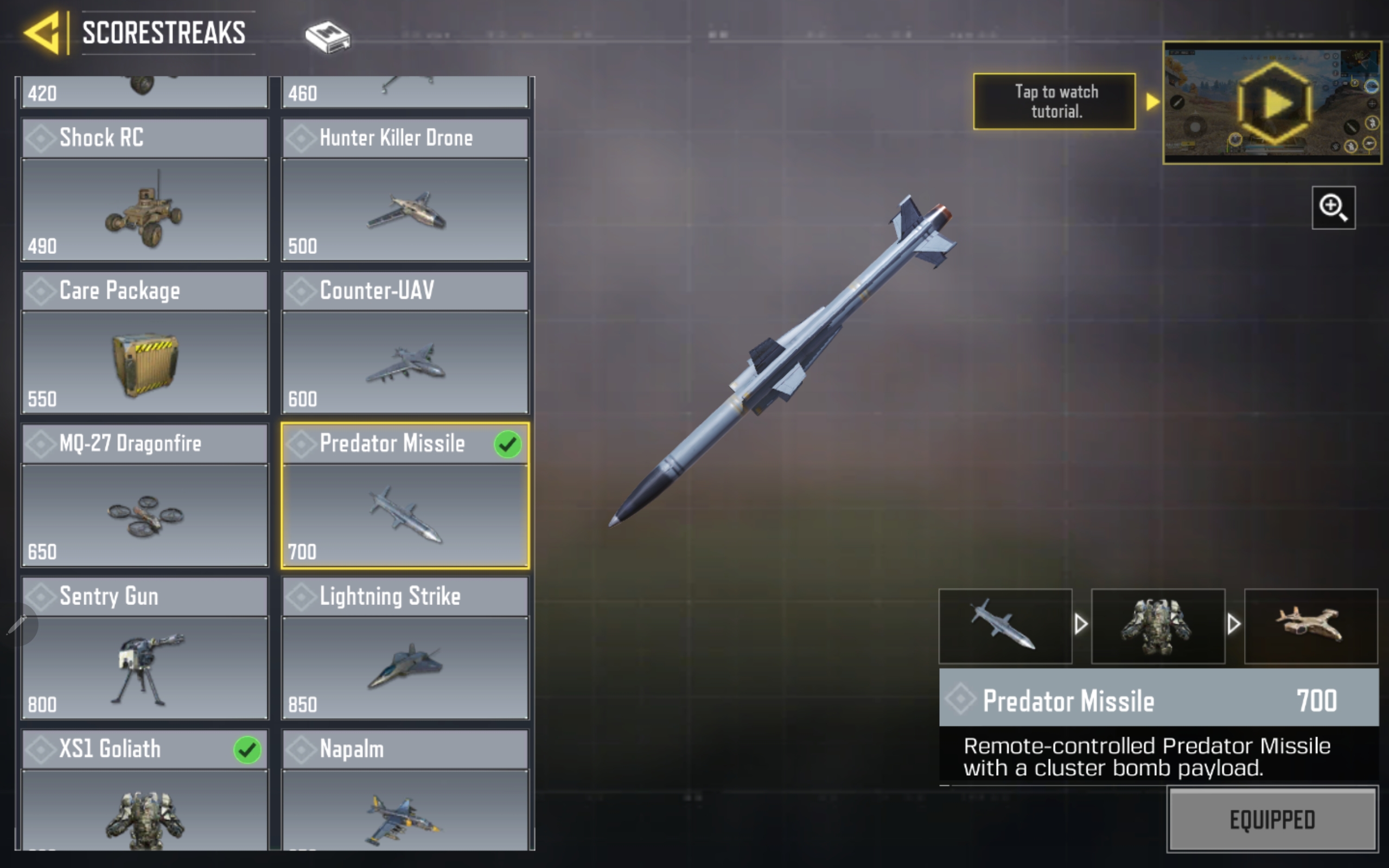 So, those are eight of the best Call of Duty: Mobile multiplayer scorestreaks, but you can only ever equip three of them for a match loadout. I recommend equipping a low, mid, and high cost scorestreak for the best balance. Shock RC and UAV are good, cheap scorestreaks, while Predator Missile, Sentry Gun, and XS1 Goliath are the best mid-cost ones. Select the VTOL, Stealth Chopper, or Chopper Gunner for a higher activation cost scorestreak with which to inflict mass kills.