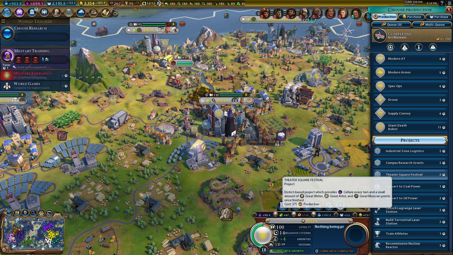 You will have access to district projects with which you can convert cities’ production into specific yields during the late game in Sid Meier’s Civilization 6. For example, Campus Research Grants generate additional science when ongoing and also great person points for scientists when completed. I recommend running the Carnival and Campus Research projects to boost culture and science for unlocking remaining tech and civics quicker in the late game. You can also boost great person points for attracting more great engineers, scientists, and cultural figures to your civilization by running such projects.