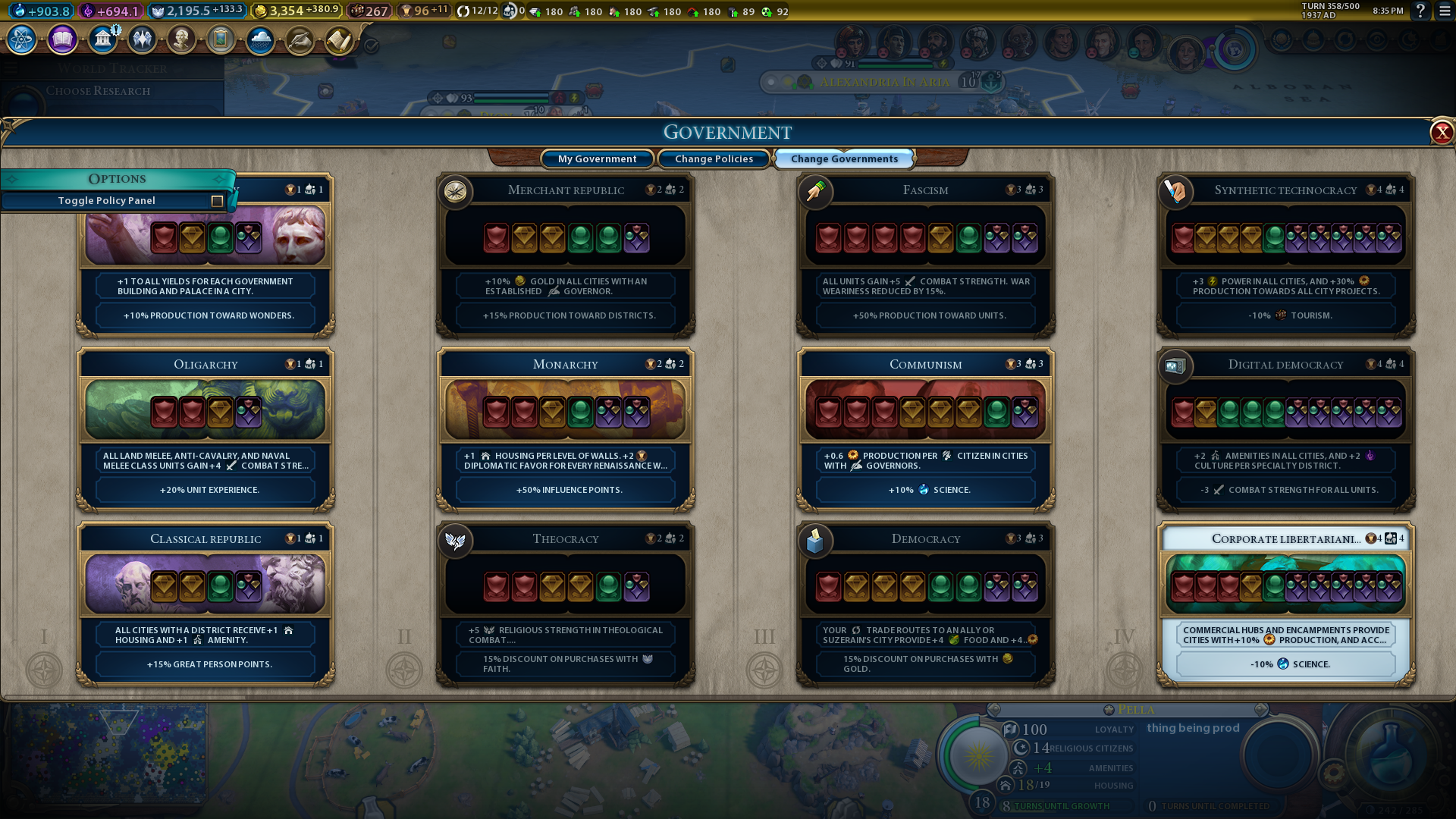 Tier 4 governments offer big advantages over tier 3 alternatives with their five wildcard slots, so long as their negative effects won’t affect the victory condition you’re aiming for. For example, selecting Digital Democracy if you’re not planning on going to war. If you’ve already researched all the technologies, select the Corporate Libertarianism government. The -10% tourism effect of Synthetic Technology won’t matter at all if you’re playing for a Domination Victory.