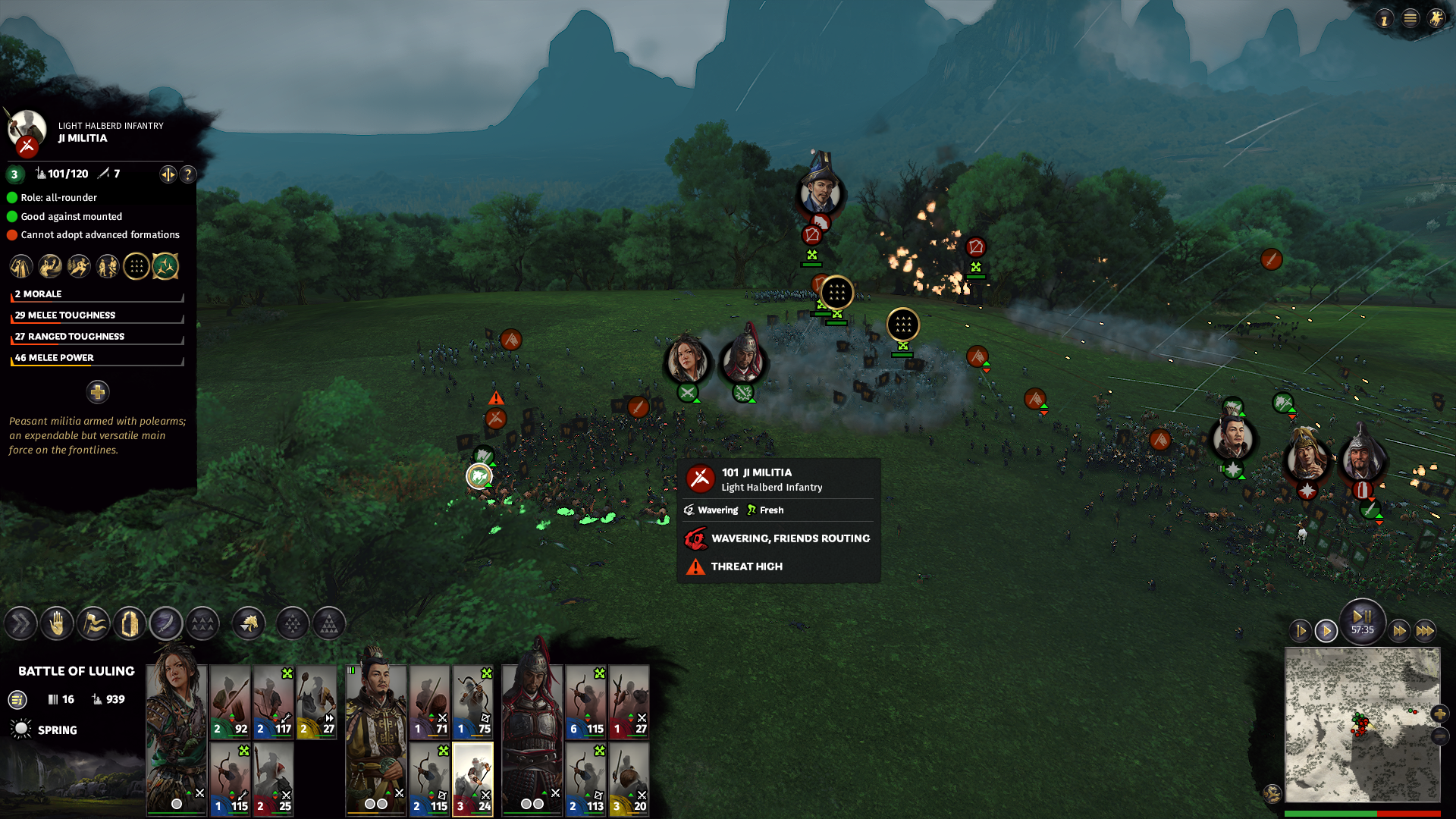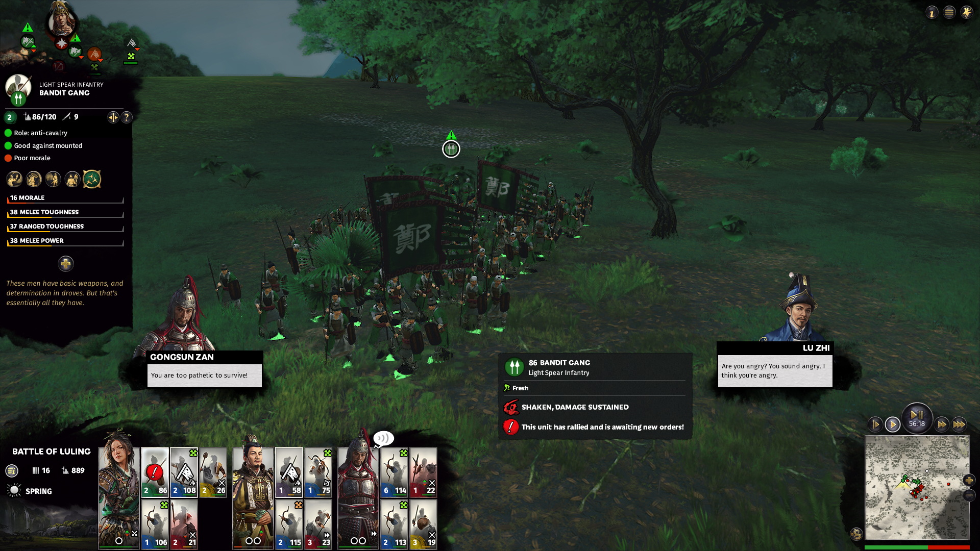 Morale is a crucial to winning Total War: Three Kingdoms battles. If you can generally break the morale of the enemy army, you will probably win the battle. You can check the morale of enemy units by clicking on them. Focus on attacking enemy units with low morale, which are easier to knock out of battles. When an enemy unit routs, that will also reduce the morale of those divisions around it (on the same side), which can generate a chain rout domino effect.
