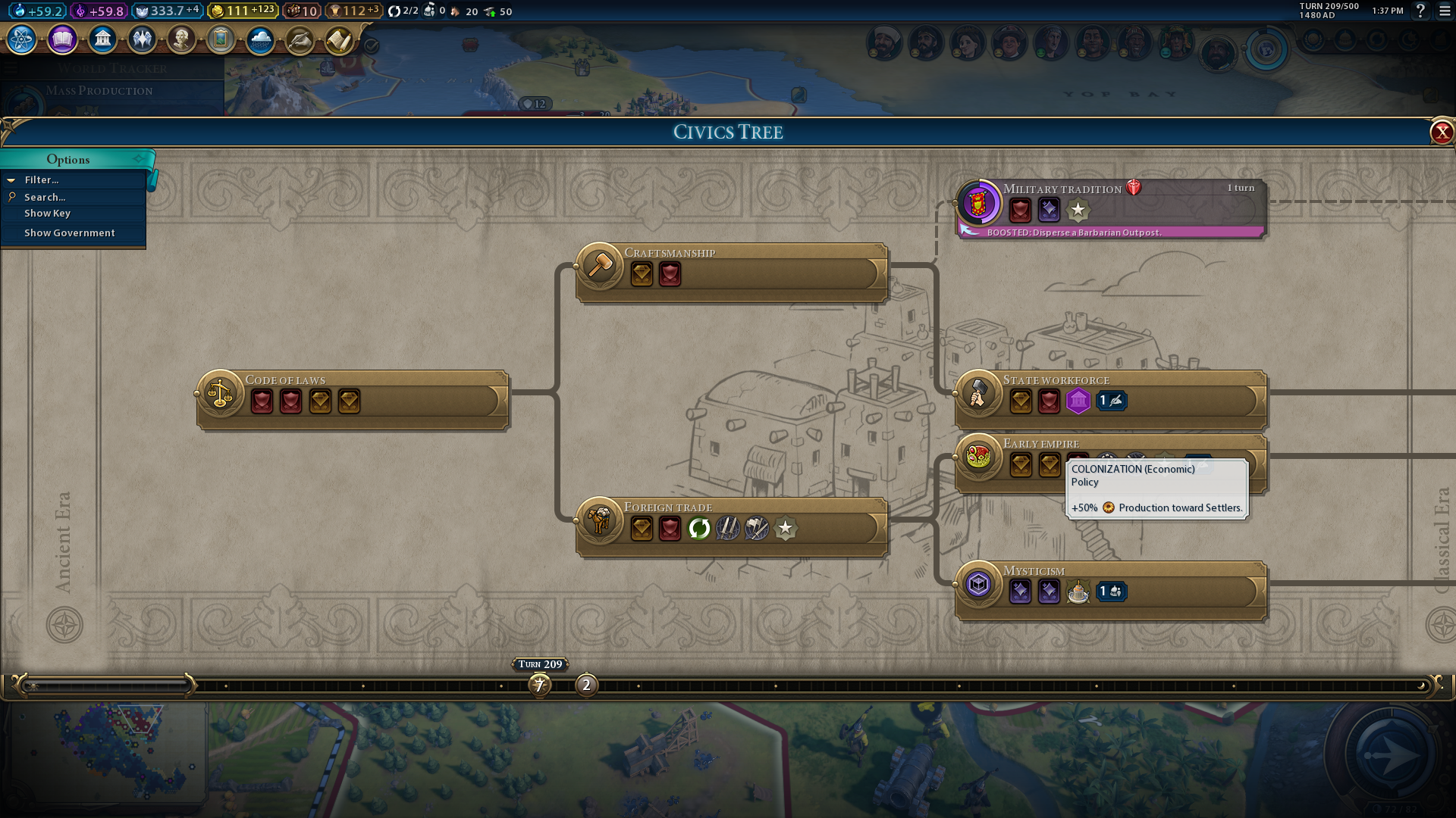 Early Empire is one of the best civics on the Civ 6 civic tree, mainly because of the Colonization policy card it unlocks. The 50% production boost for Settlers that the card gives you is crucial for peaceful civilization expansion, particularly during the early game when there’s more open territory. Early Empire also unlocks the Limitanei and Land Surveyors policy cards for increasing city loyalty and reducing tile purchase costs.