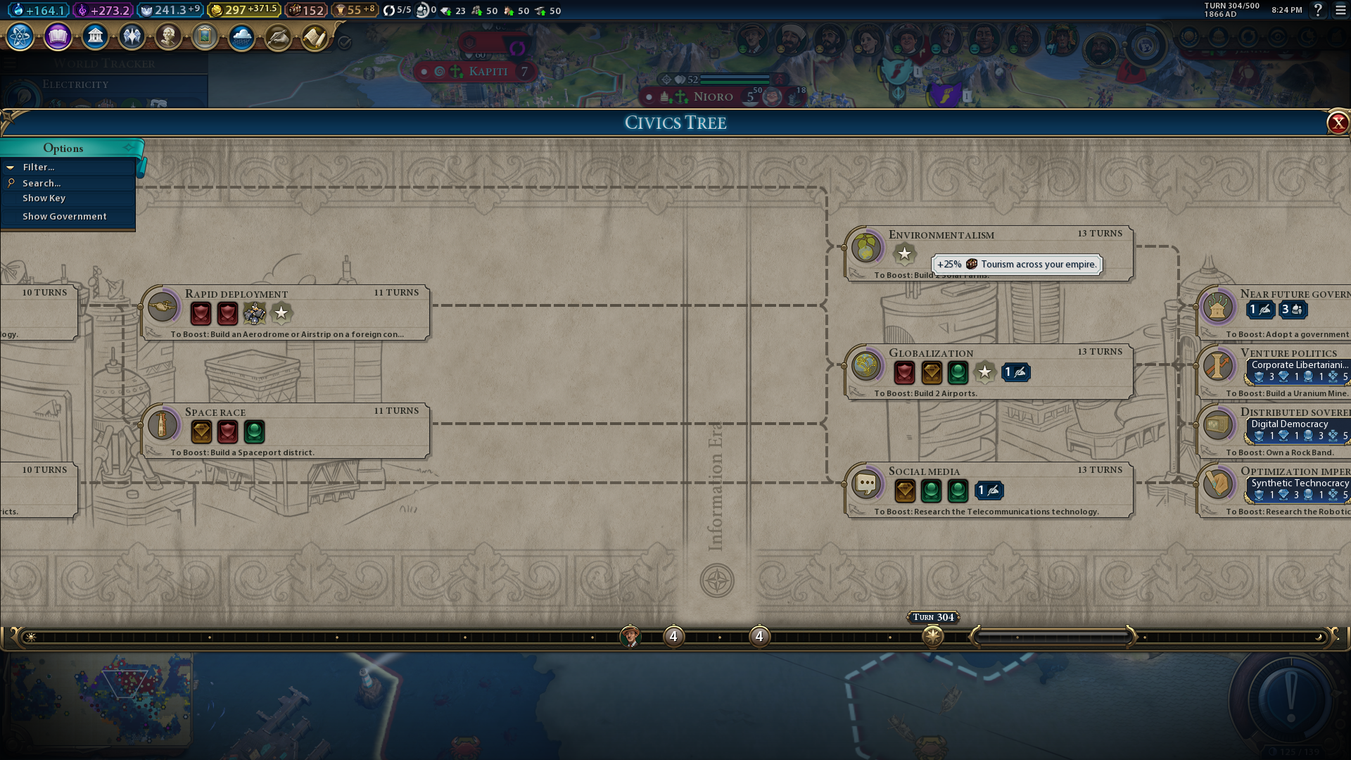 Globalization is a late-game civic that’s invaluable for players seeking scientific victories with the Ecommerce and International Space Station policy cards it unlocks. The Ecommerce card in the vanilla Civilization 6 game is an overpowered one that gives each of your international trade routes a +10 gold and +5 productivity yield boost. Establishing four or five trade routes in a Spaceport city with the Ecommerce policy selected can give a city a huge production boost for space race projects. However, the overall economic boost Ecommerce generates makes it a good policy for all victory conditions.