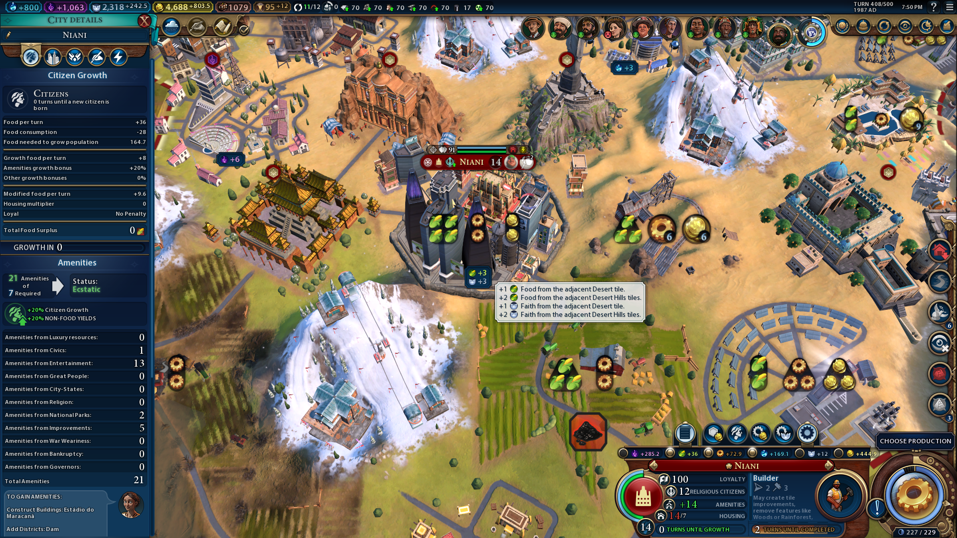 Songs of Jeli is the civ ability for the Mali civilization. That ability generates a +1 faith and +1 food yield bonus for each desert hill tile adjacent to a city center. For example, that ability will generate +3 faith and +3 food for a city center placed beside three desert hills. Plus, this civ ability enables you to purchase Commercial Hub buildings with faith.