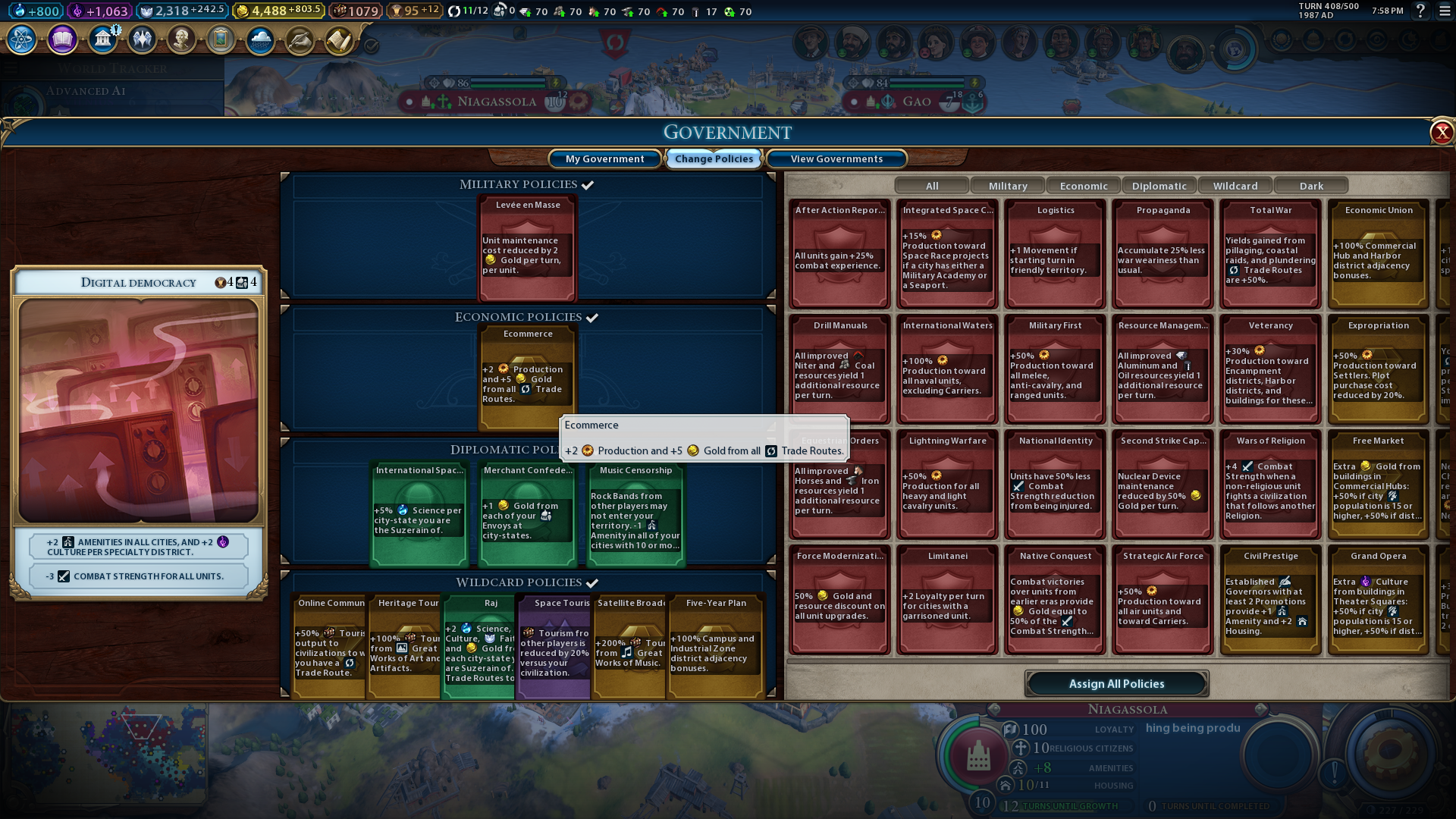 Select policy cards that will make your Mali trade routes even more lucrative. For example, the Triangular Trade is a good one for players seeking religious victories, as that gives each of your trade routes a +4 gold and +1 faith yield trade boost. Make sure you select the Ecommerce policy card in the late game to give your trade routes a significant +5 gold and +2 production boost.