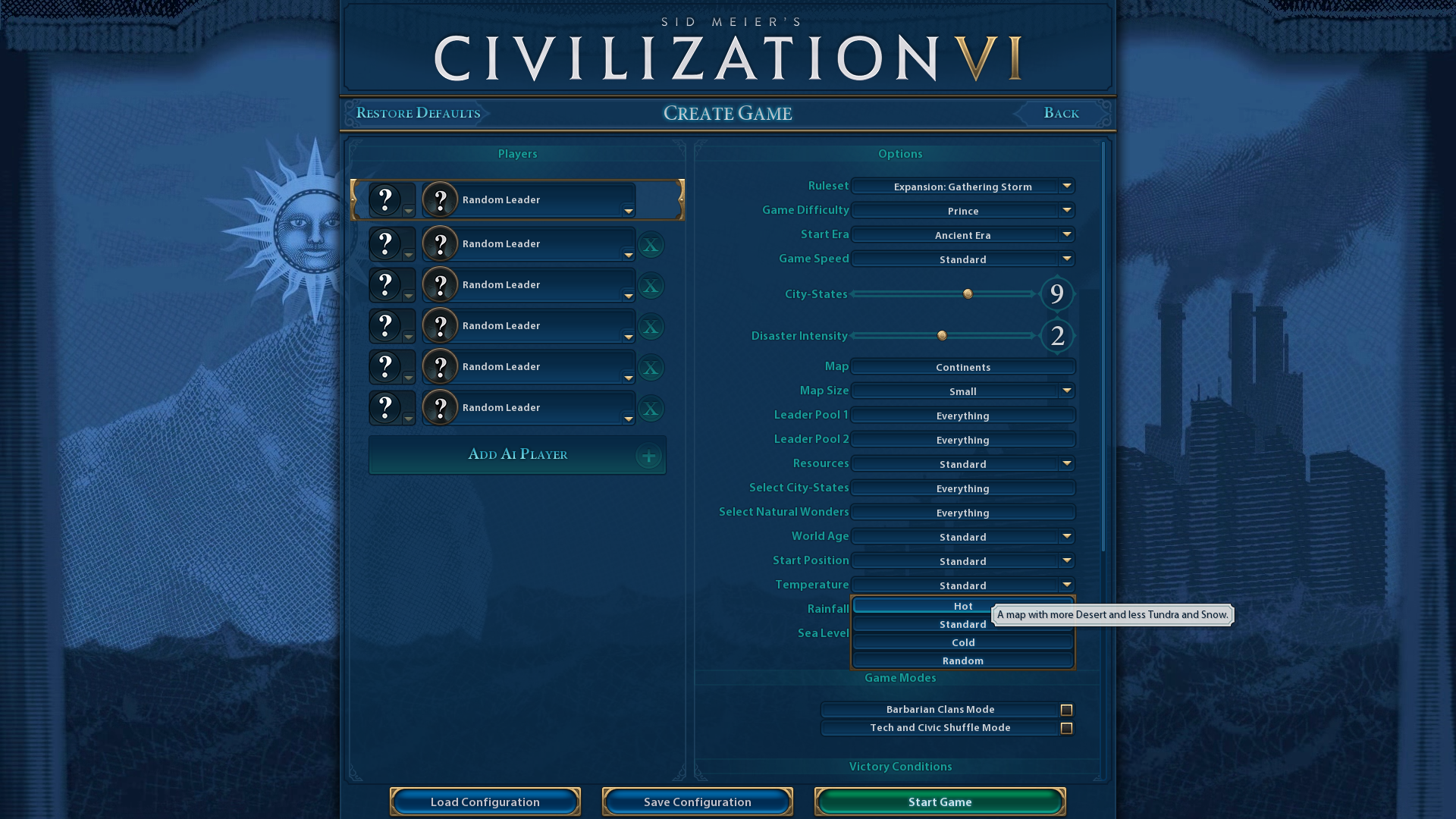 When starting a Mansa Musa Civ 6 game, make sure you configure advanced settings to ensure the map includes more hills and desert terrain for you to exploit. The map will generate more desert terrain with Hot selected for the Temperate setting. To ensure there are more hills for mining, set the World Age setting to New.