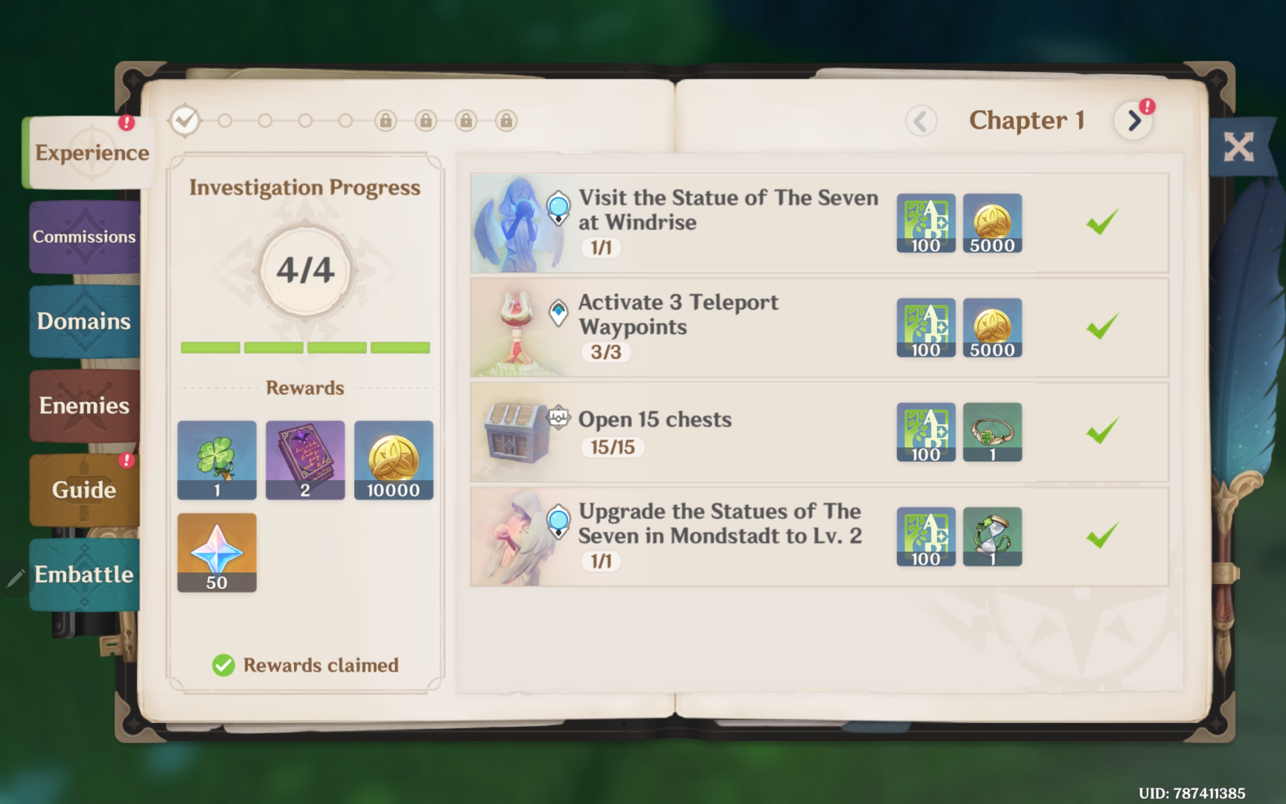 The Adventurer’s Guild assigns four commissions every day. Those purple-marked tasks appear on the map for you to complete. Completing such tasks will increase your Genshin Impact Adventure Rank EXP by about 175 to 250. This is a good way to increase Genshin Impact Adventure Rank because it doesn’t usually take long to complete commissions.