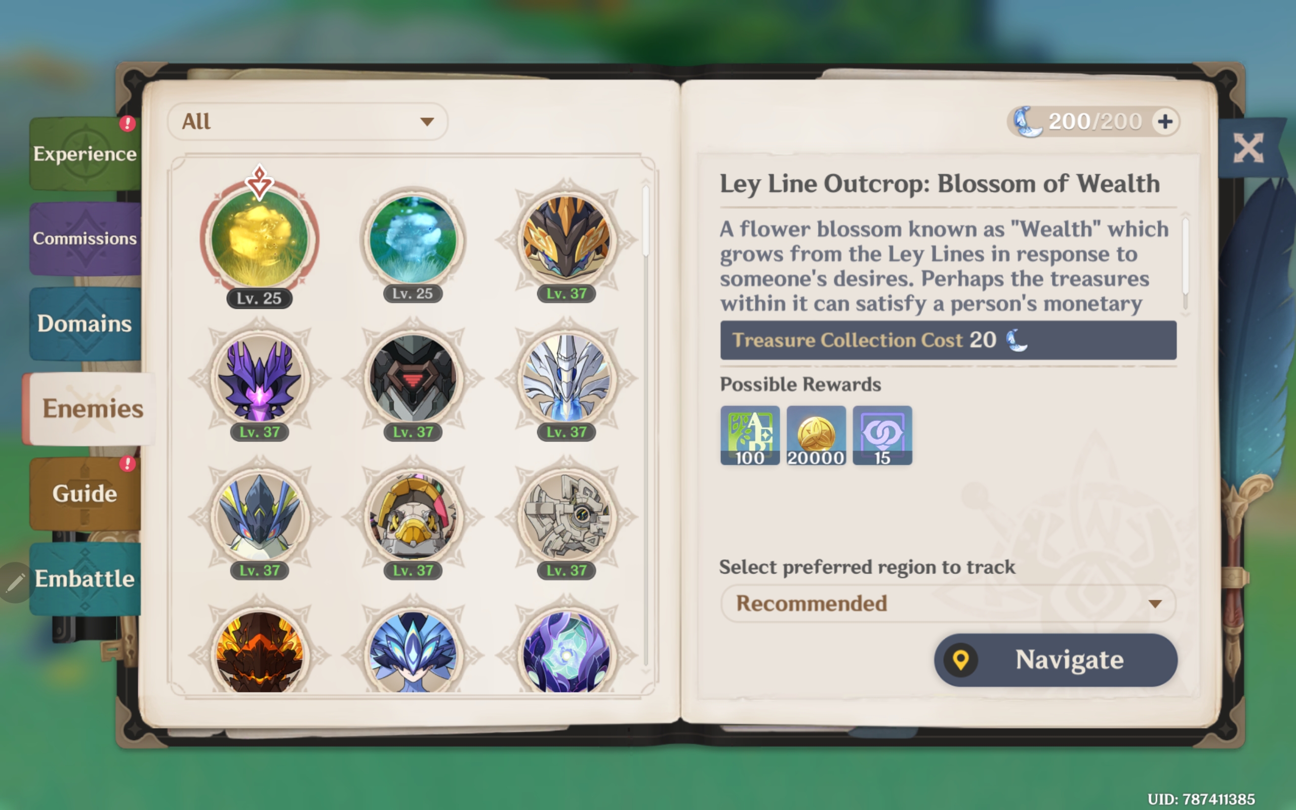 Genshin Impact’s world includes a variety of boss enemies on the outer map beyond Domains. The Adventurer’s Guidebook includes an Enemies tab that lists common and elite bosses for you to defeat. Defeating bosses will give you additional bonuses and more Adventure Rank EXP (typically 200 EXP). Select the Navigate options for the listed bosses to mark them on the map so you can find and defeat them.